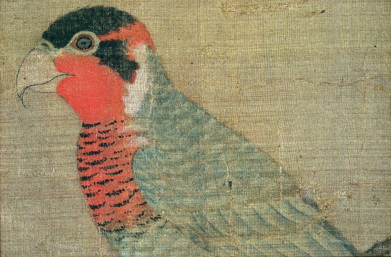 鹦鹉在古代被视作为是有智慧的鸟,如同徽宗所言,鹦鹉能“惠吐夛言”,系祥瑞之禽,徽宗称之为“瑞雅”。据幅上徽宗所题,画中的鹦鹉是来自遥远的“岭表”的供品,“岭表”即今广东、福建一带,唐代刘恂有《岭表录异》卷中说道:“容管廉白州产秦吉了,大约似鹦鹉嘴,脚皆红,两眼后夹,脑有黄肉冠。善效人言,语音雄大,分明于鹦鹉。以熟鸡子和饭如枣饲之。或云容州有纯白者,俱未见之也。”可知岭表是盛产奇异鹦鹉的地方。大凡宋人见到此类祥物,总要记上一笔,如熙宁六七年间,一段姓商贾,养一鹦鹉,能诵李白宫词、心经,还能待客,一出狱的访客怜其被囚,将其放归,鹦鹉归林后,见有商旅之车,都要问及段二郎安否。