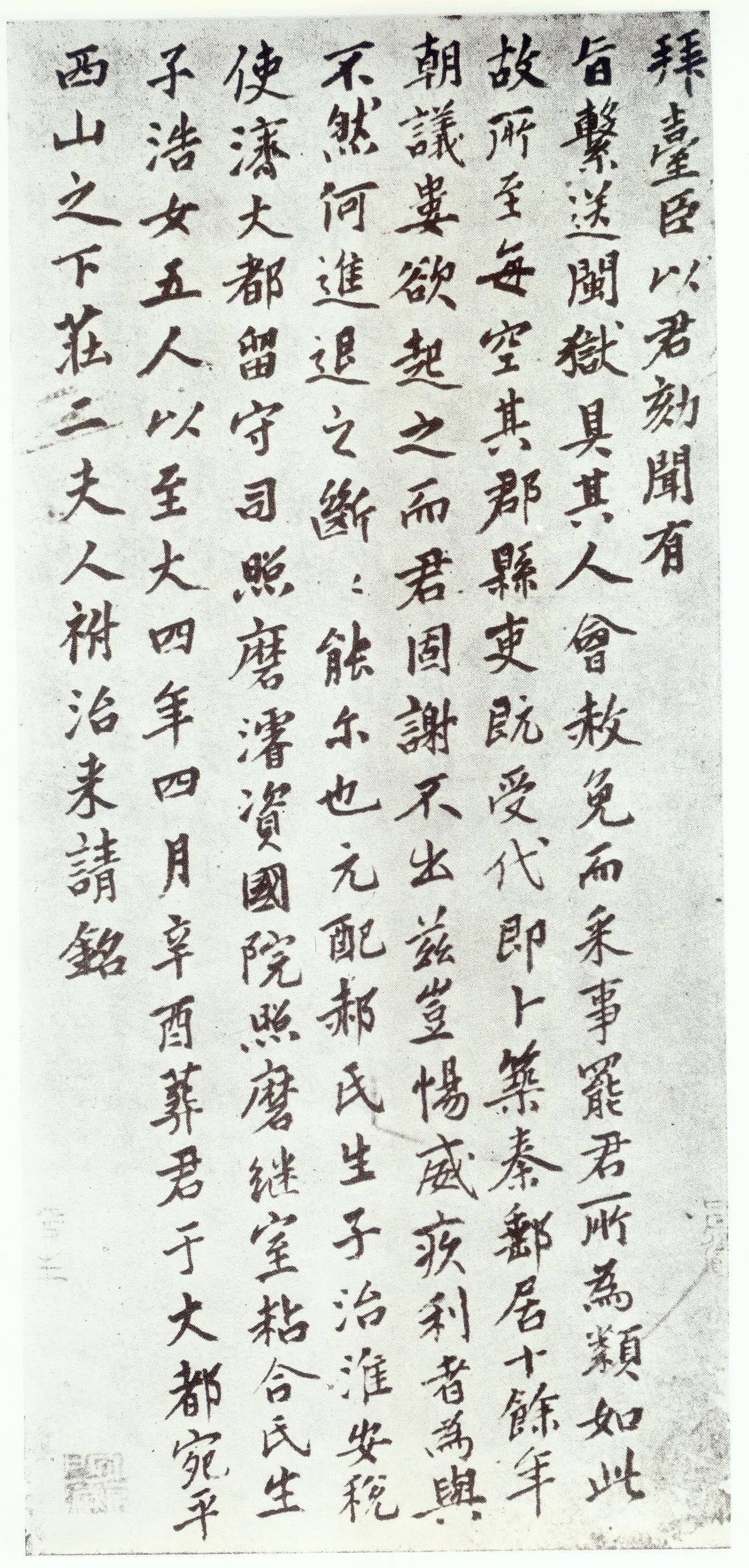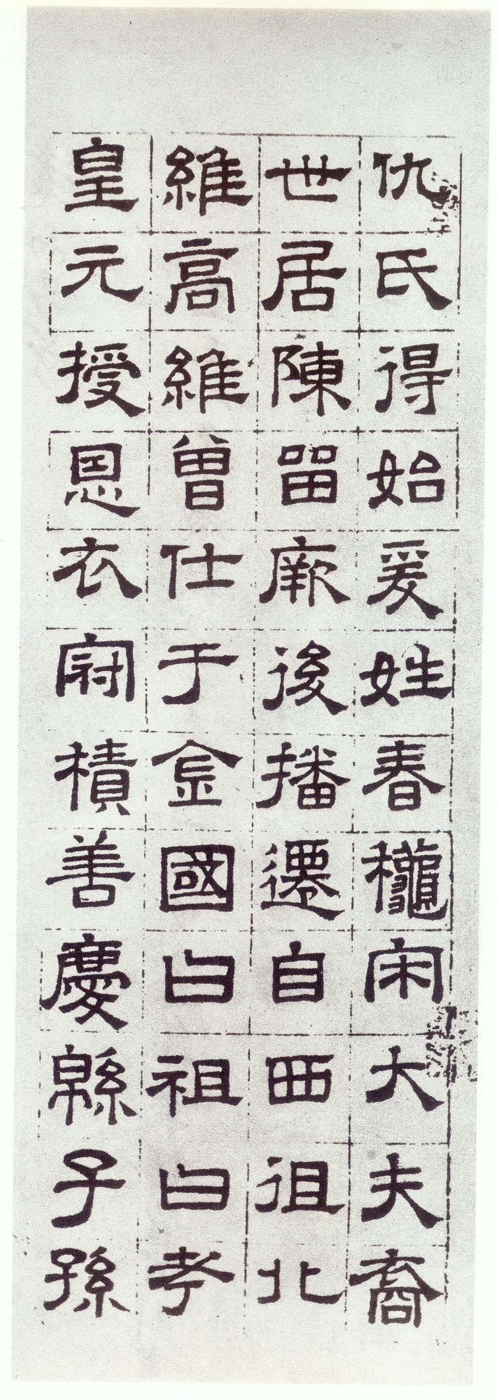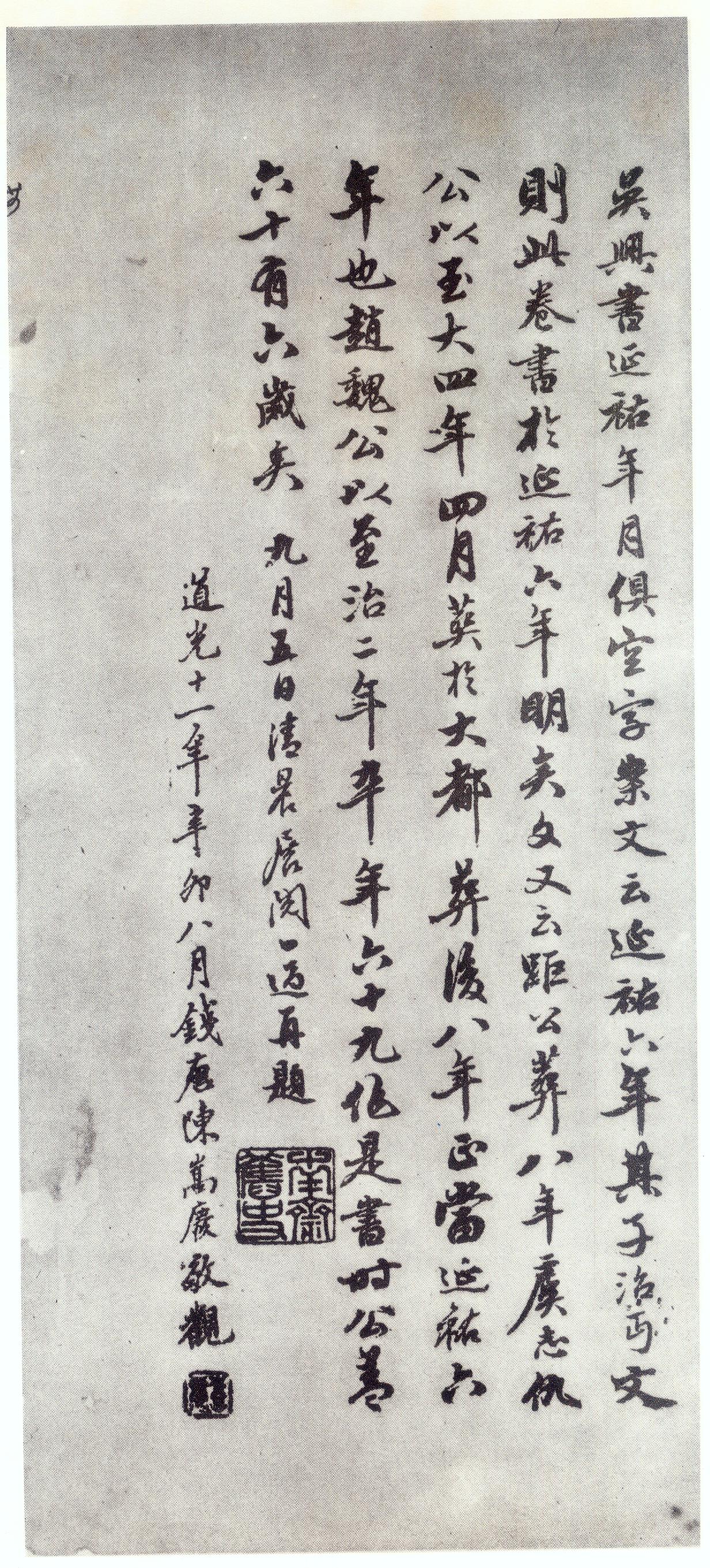 行楷书墨迹。卷高37.2厘米,共一百九十二行,满行六字, 并篆题引首《有元故奉议大夫福建闵海道肃政廉访副使仇府君墓碑铭》二十四字, 其中“建闵海道肃政廉访”八字原已损缺,系后人为之补书。
