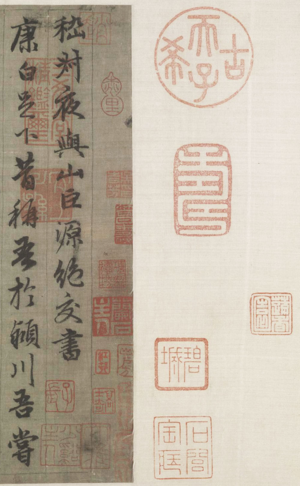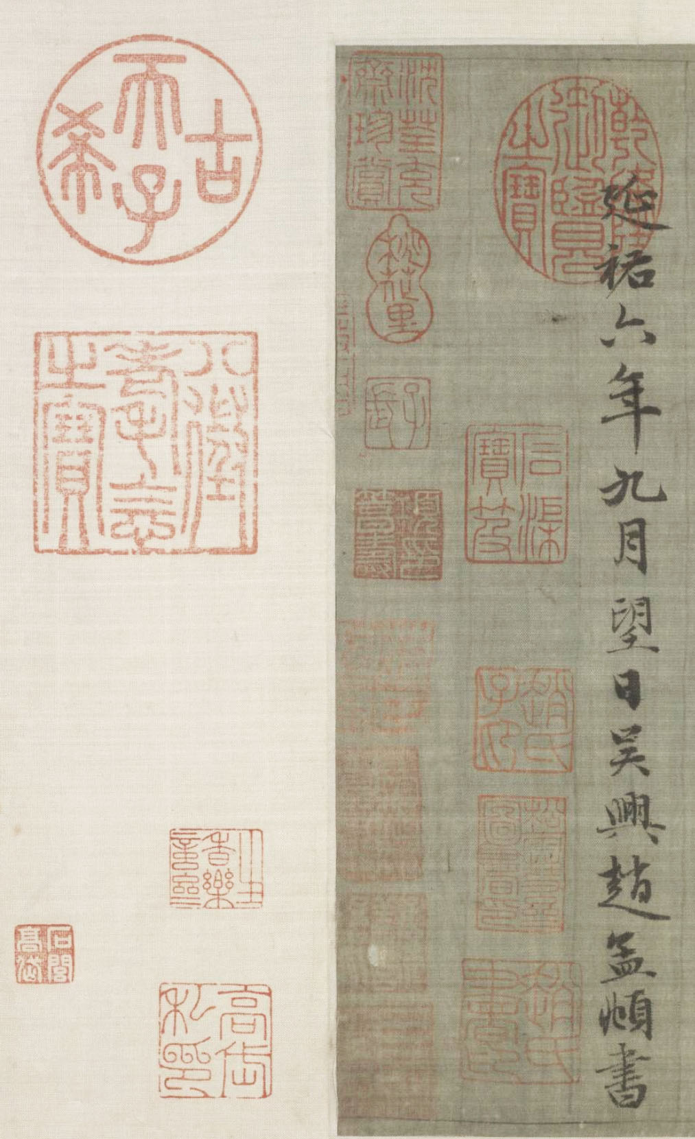 鉴藏印:“懋和”白文印,“吴时方印”白文印,“项”朱文印,“子长”朱文印,“桃里”朱文印,“少溪主人”朱文印,“项笃寿印”白文印,“桃花里”朱文印,“蒋氏珍藏”,“子子孙孙善宝之”白文印,“梧桐轩图书印”,“三径清风”,“项德梤印”朱文印,“兰石主人”白文印,“碧城”朱文印,“沈荃充斋珍赏”朱文印,“蔬香园”白文印,“高士奇”朱文印,“江村”朱文印,“竹窗”朱文印,“江邨高氏精鉴”朱文印,“石闾宝藏”朱文印,“高岱私印”白文印,“石闾高岱”白文印,“生香乐意斋”朱文印,“苑西”朱文印,以及“古希天子”朱文印,“寿”白文印,“乾隆鉴赏”白文印,“三希堂精鉴玺”朱文印,“宜子孙”白文印,“乾隆御览之宝”朱文印,“重华宫鉴藏宝”朱文印,“乐善堂图书记”朱文印,“八征耄念之宝”朱文印,“嘉庆御览之宝”朱文印等。