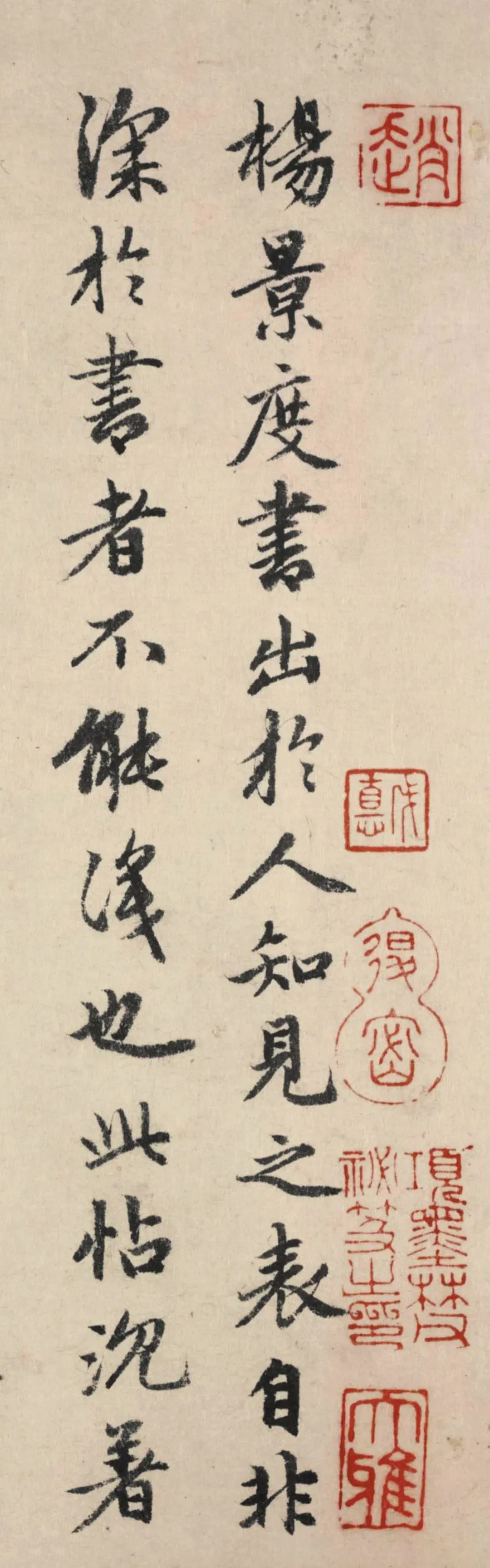 释文:杨景度书,出于人知见之表,自非深于书者,不能识也。此帖沉着而又萧洒,真奇迹,可宝藏。 款识:延祐丙辰岁(1316)十一月十三日,吴兴赵孟頫题。 钤“赵氏子昂”朱文印,“赵”朱文印。