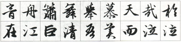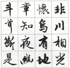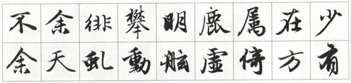 在行草书中,捺法也是富于变化的点画之一。除了上面分析的笔法上的不同处理方法外,它还有角度、轻重、方圆、收放等方面的变化。我们在临写时可先分类练习,待笔法熟练后,再结合具体字例找出它的变化规律,以使融会贯通。