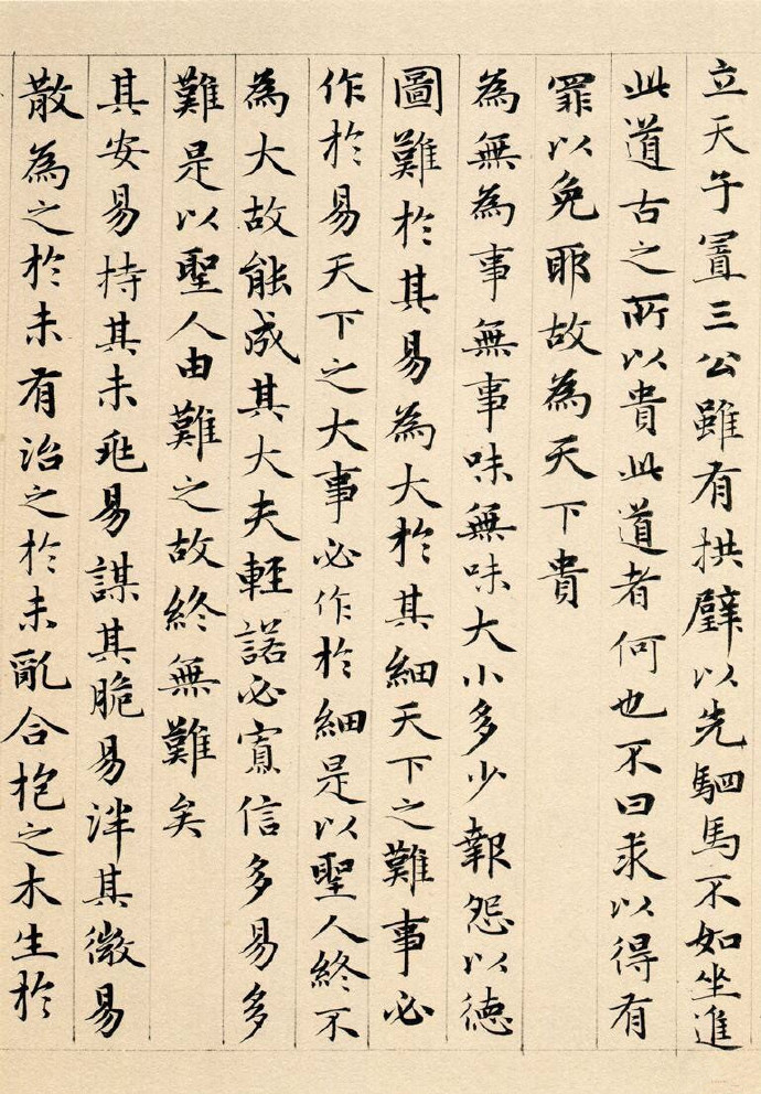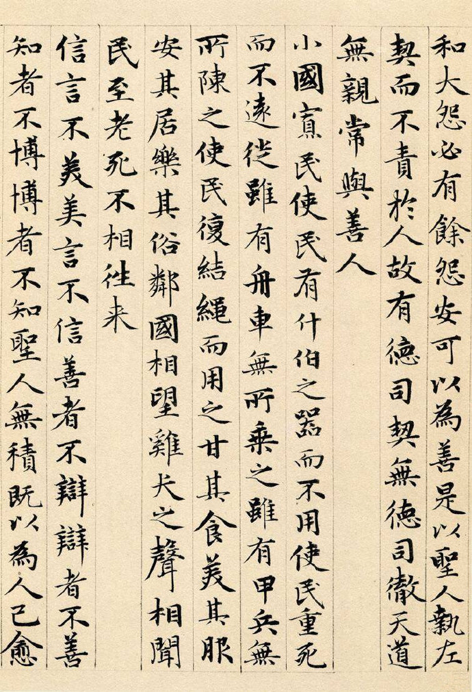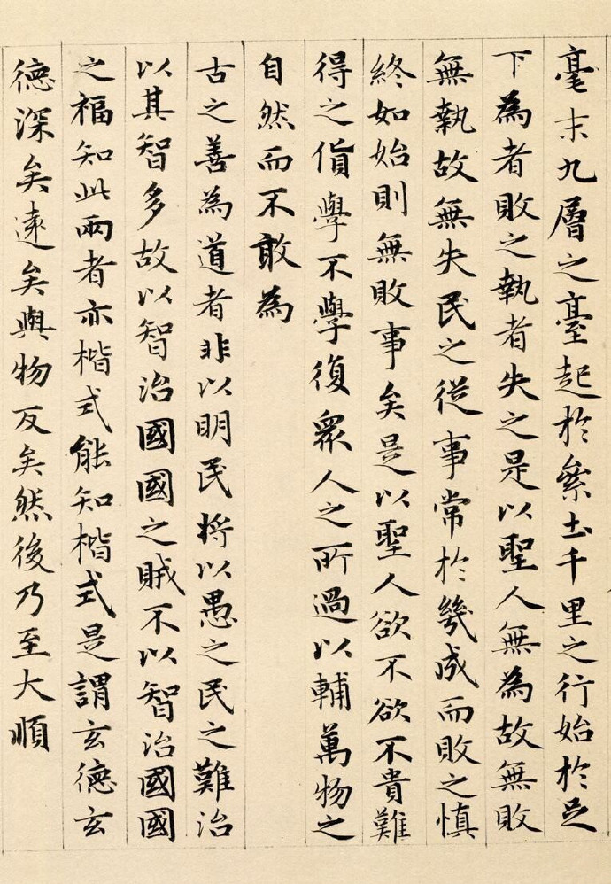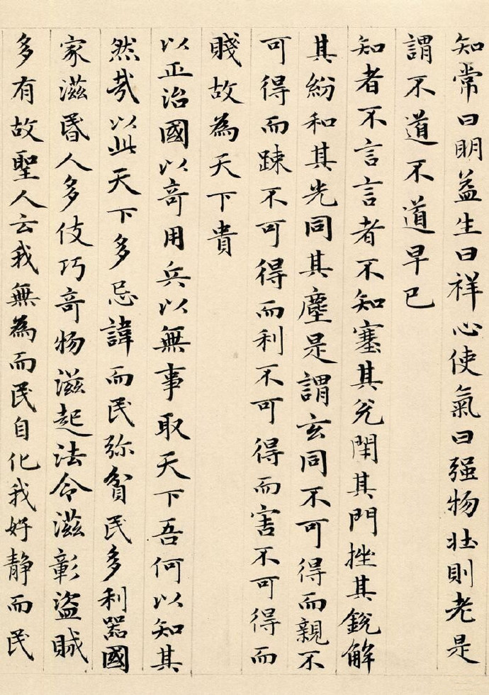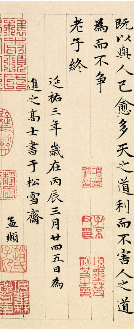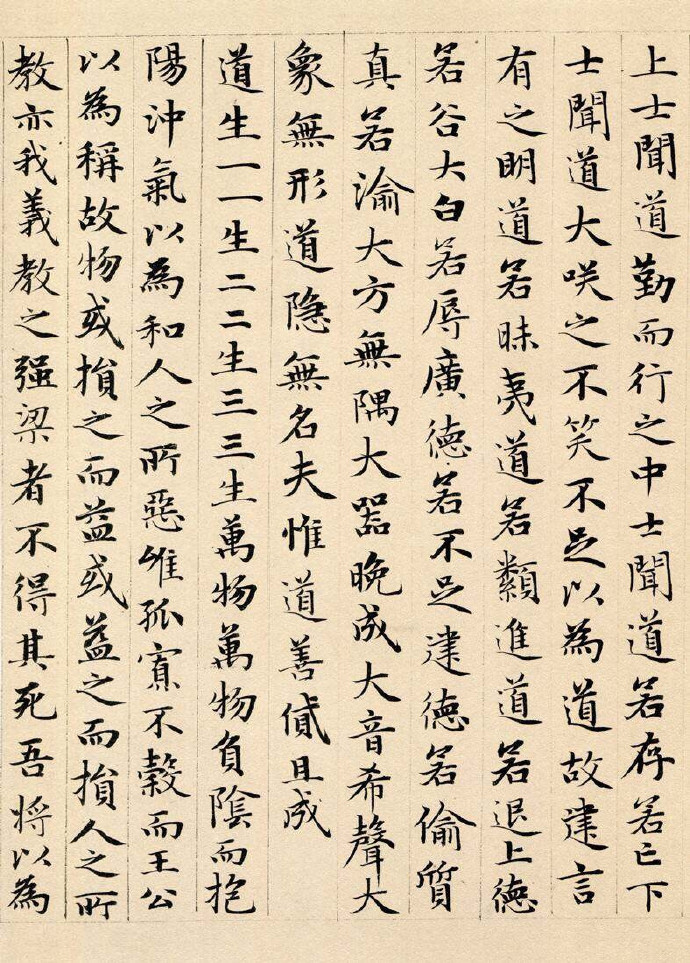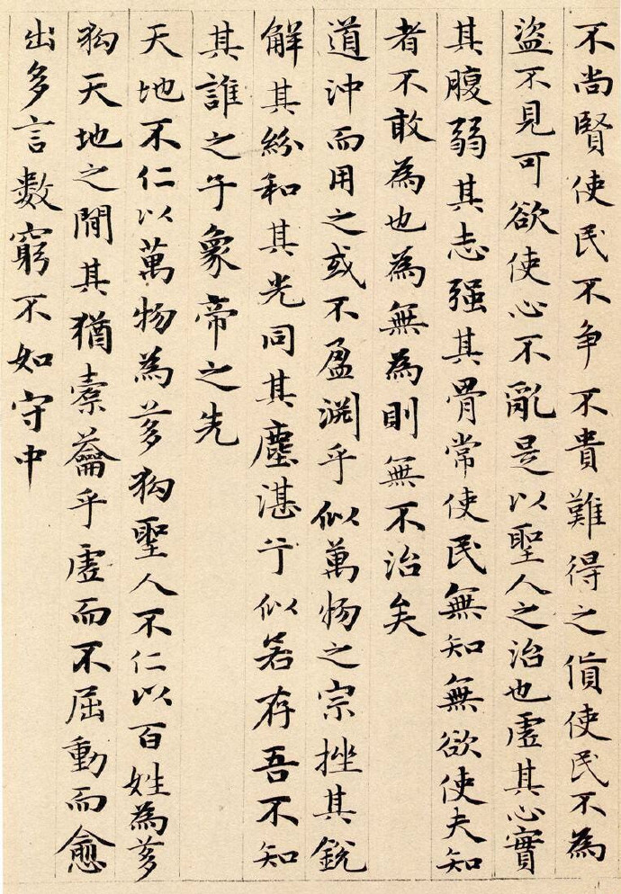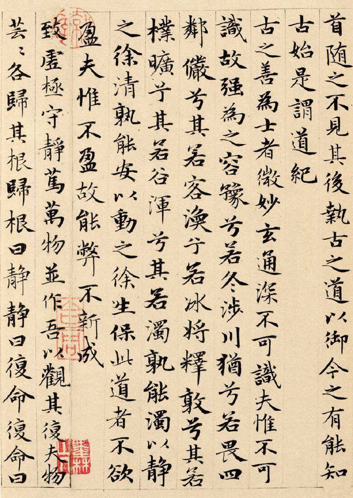 赵孟頫此卷小楷《道德经》,堪称晚年小楷之精品。他一生曾多次抄写《道德经》,亦绘老子像,大抵多为道家作。在他的友人中如南谷真人杜道坚、看云道人吴全节,他不论年龄均称尊师,此外,如茅山道士刘真人、从其学书者句曲外史张雨等,都与他有很深的交往。这不仅使赵孟頫对道教经典发生浓厚兴趣,也促使他向东晋道士杨羲的小楷取法。此卷落款“为进之高士书”,虽非道流,然当是受道教思想影响的隐士。赵孟頫一生所写各种道经甚伙,从一个侧面反映了道教在元代的社会地位和影响。