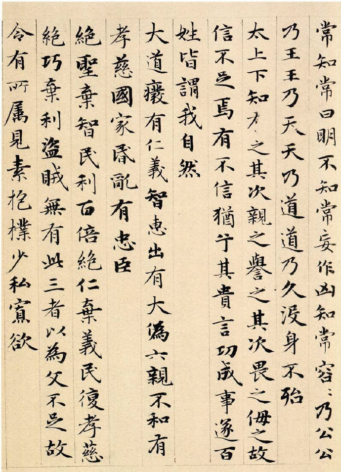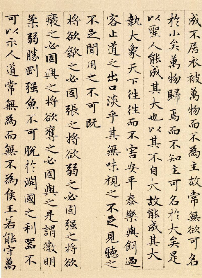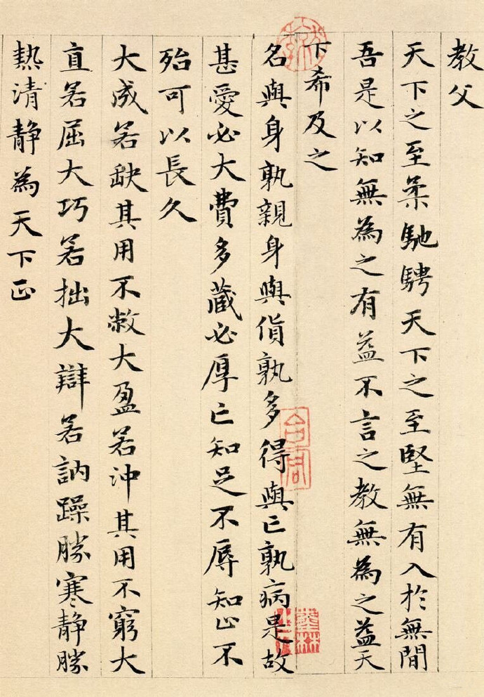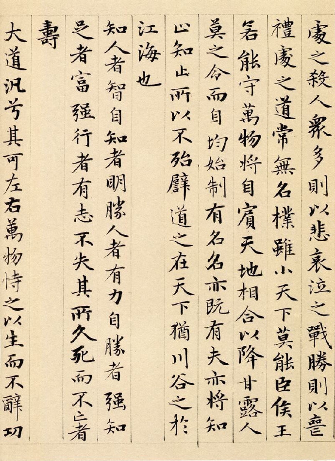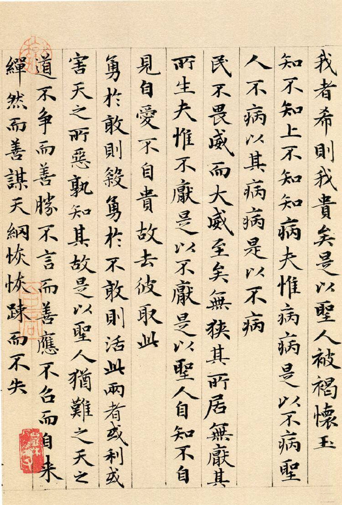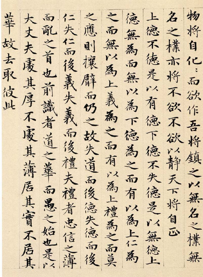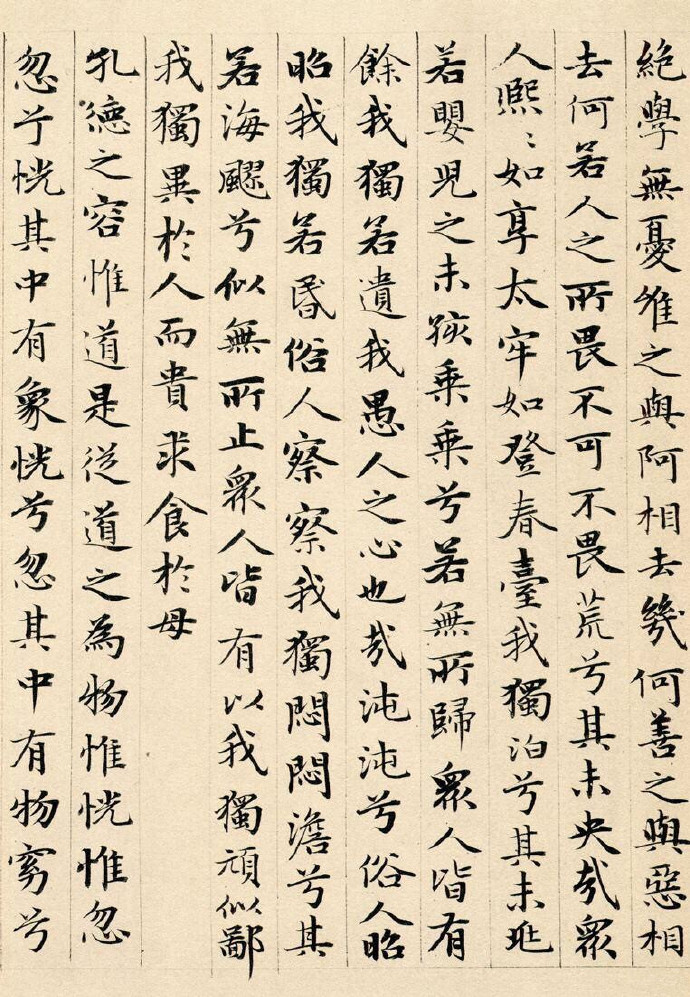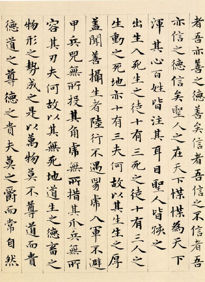 赵孟頫此卷小楷《道德经》,堪称晚年小楷之精品。他一生曾多次抄写《道德经》,亦绘老子像,大抵多为道家作。在他的友人中如南谷真人杜道坚、看云道人吴全节,他不论年龄均称尊师,此外,如茅山道士刘真人、从其学书者句曲外史张雨等,都与他有很深的交往。这不仅使赵孟頫对道教经典发生浓厚兴趣,也促使他向东晋道士杨羲的小楷取法。此卷落款“为进之高士书”,虽非道流,然当是受道教思想影响的隐士。赵孟頫一生所写各种道经甚伙,从一个侧面反映了道教在元代的社会地位和影响。