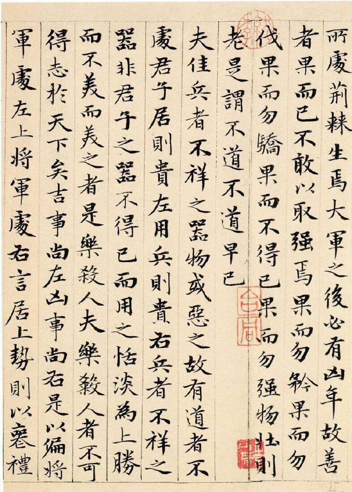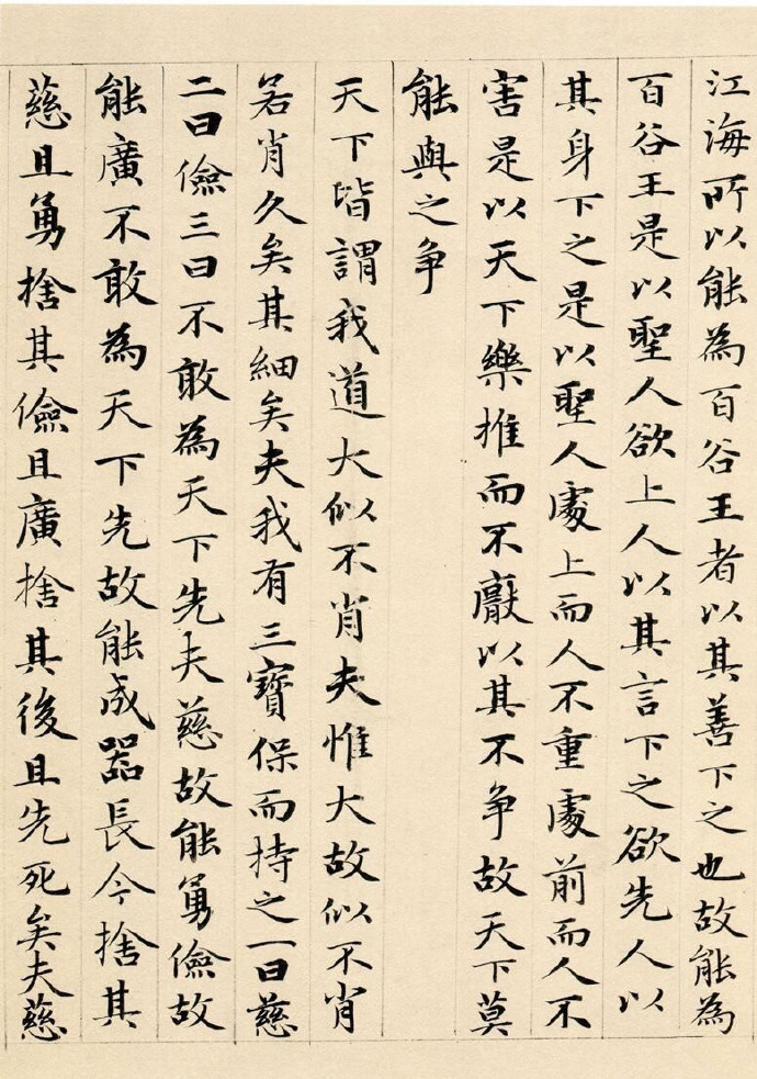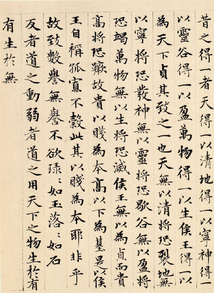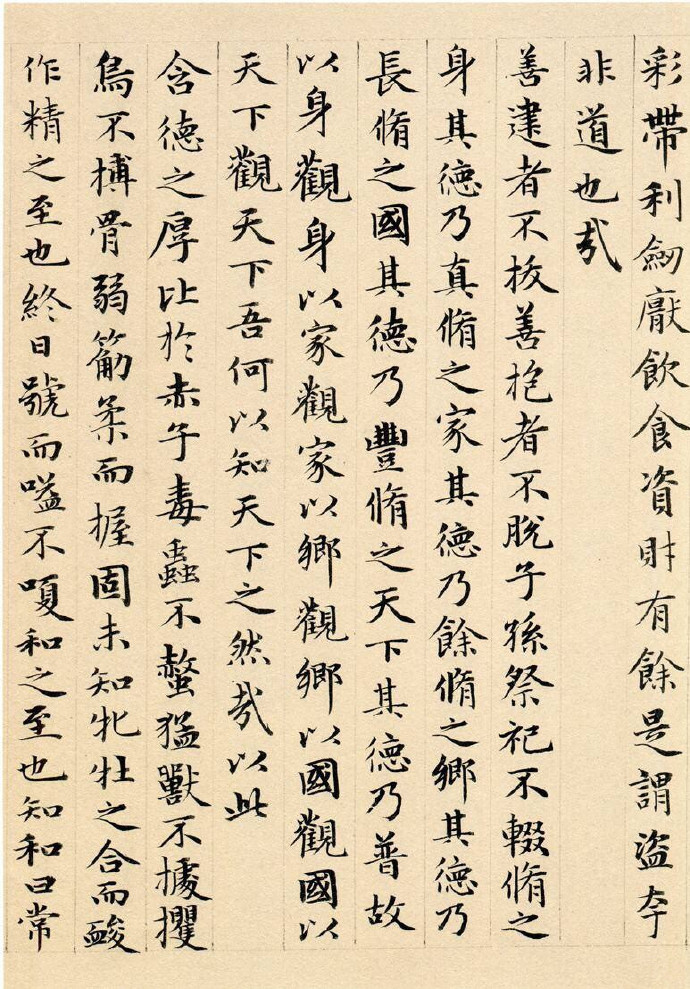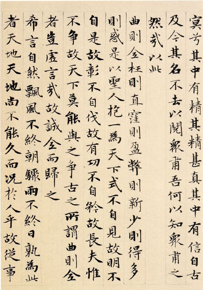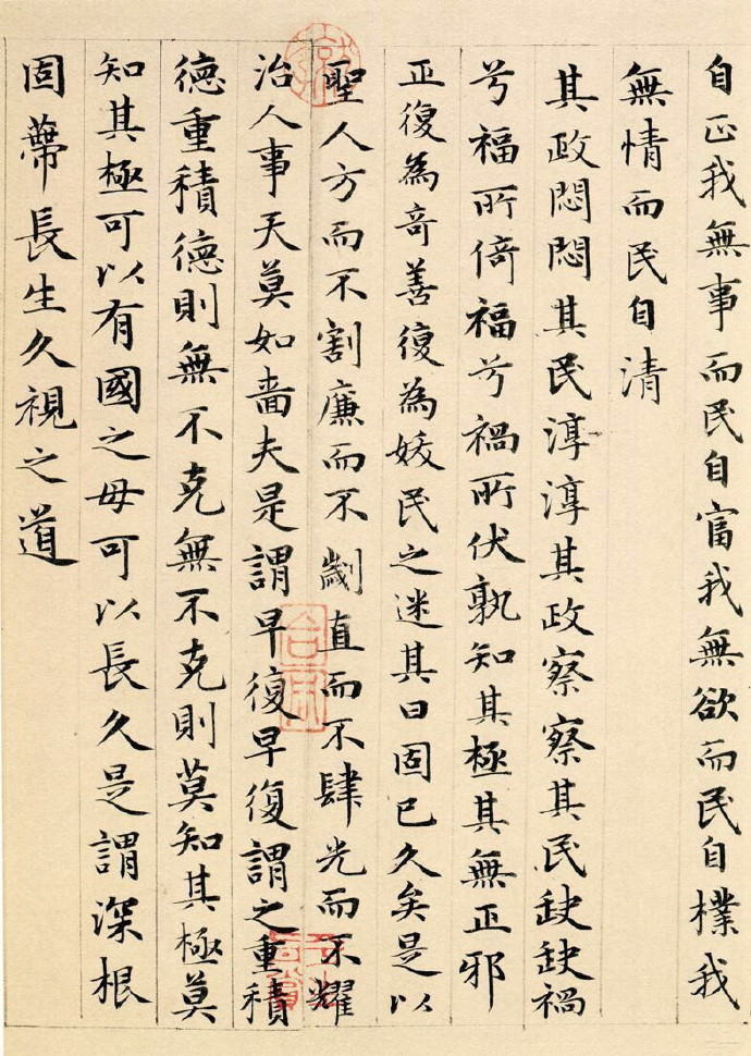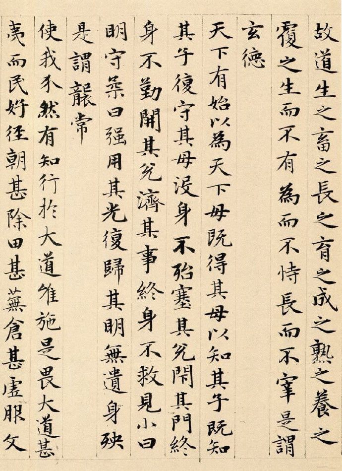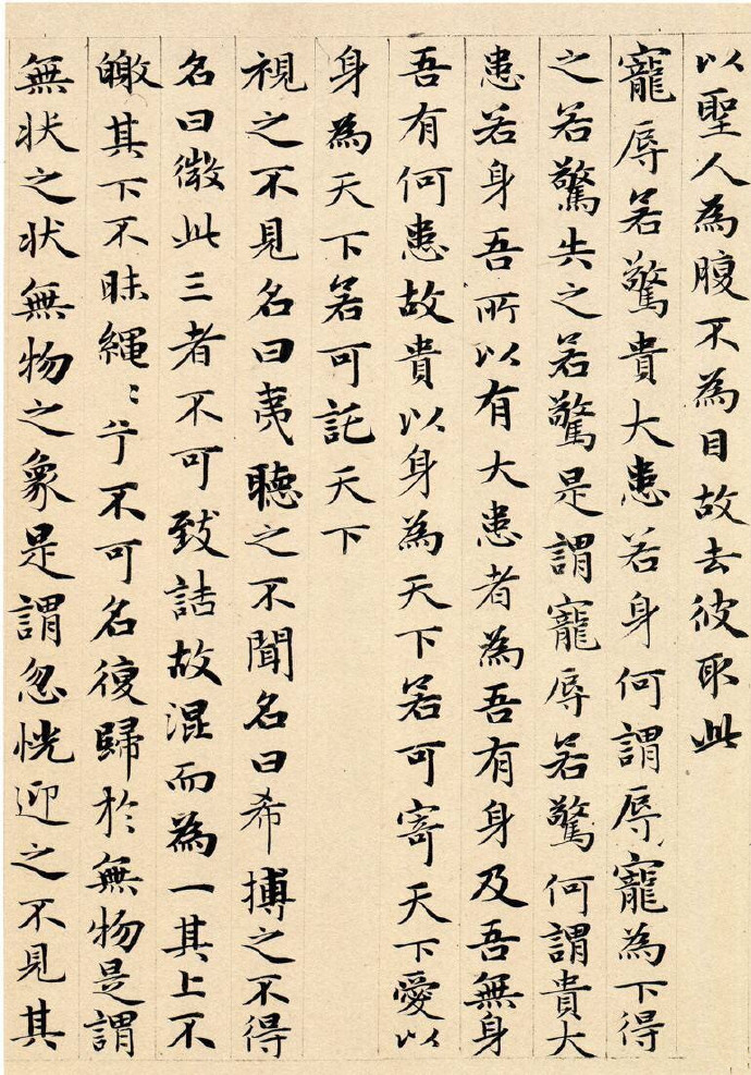 赵孟頫此卷小楷《道德经》,堪称晚年小楷之精品。他一生曾多次抄写《道德经》,亦绘老子像,大抵多为道家作。在他的友人中如南谷真人杜道坚、看云道人吴全节,他不论年龄均称尊师,此外,如茅山道士刘真人、从其学书者句曲外史张雨等,都与他有很深的交往。这不仅使赵孟頫对道教经典发生浓厚兴趣,也促使他向东晋道士杨羲的小楷取法。此卷落款“为进之高士书”,虽非道流,然当是受道教思想影响的隐士。赵孟頫一生所写各种道经甚伙,从一个侧面反映了道教在元代的社会地位和影响。