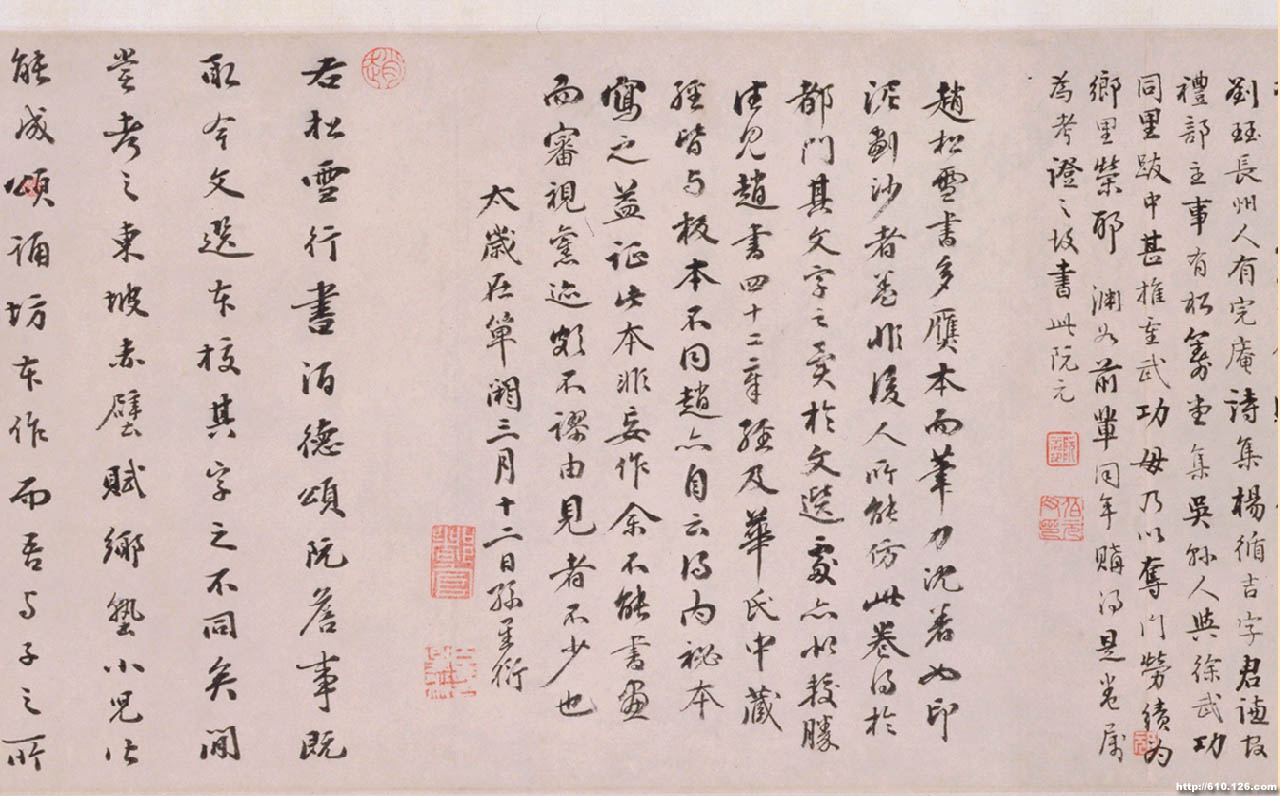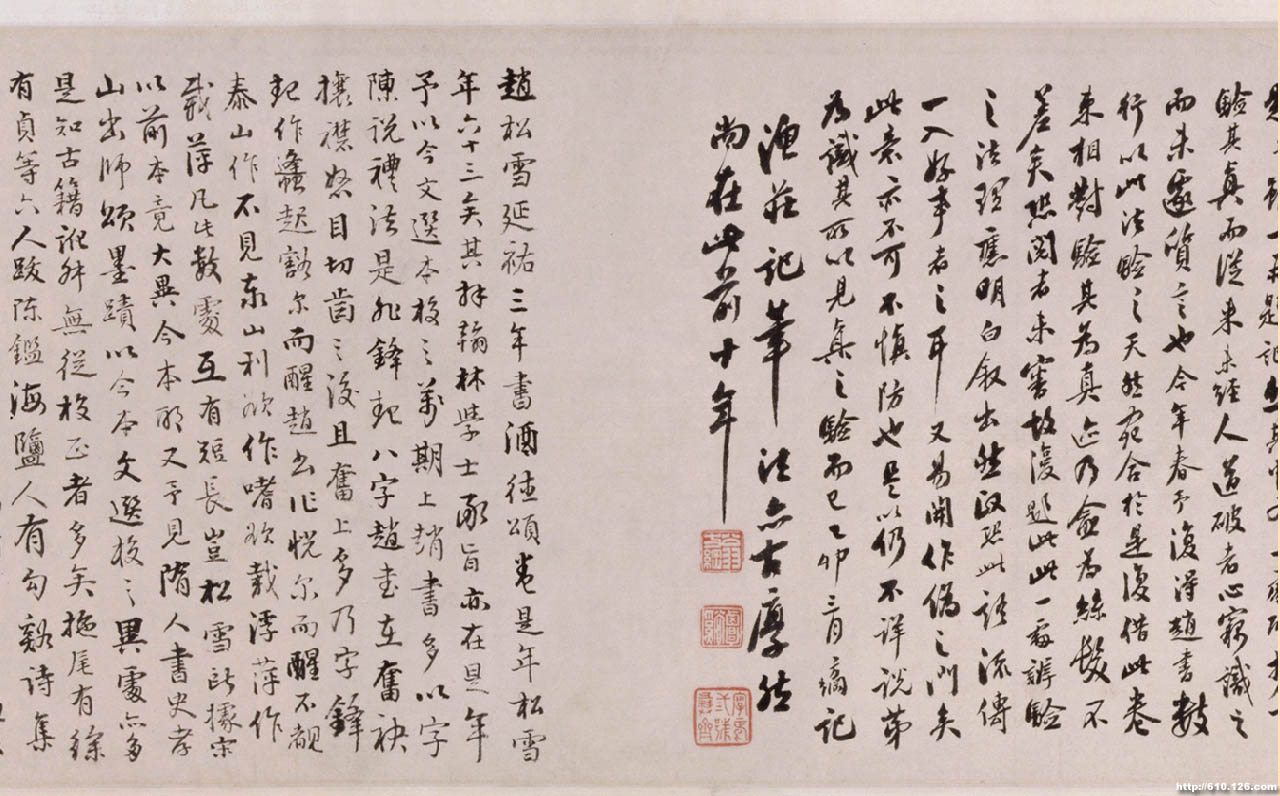 此帖笔法纵逸,又是自家风貌,肥不没骨,瘦不露筯,姿媚隽逸,出神入化,可谓人书俱老,炉火纯青,是赵氏书法的精品之作。正如帖后文彭跋所云:“信手拈来,头头是佛,若必曰'兰亭',恐不必以此论松雪。”明、清各家题跋亦对此卷推崇备至。其文校之《昭明文选》小有出入。(撰稿人:张彬)