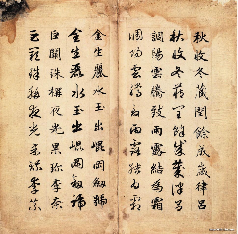 赵孟頫是继智永之后,书写《千字文》较多且最有名者,自称“二十年来写《千文》以百数”。从现存的七八种作品来看,大致可分成临作和创作两大类。前者书写的年代较早,后者则多作于其一风成熟之岳。此本《千字文》属于前者,基本是以智永的《真草千字文》为范本,艺术上保持了智永作品的典雅和流美。