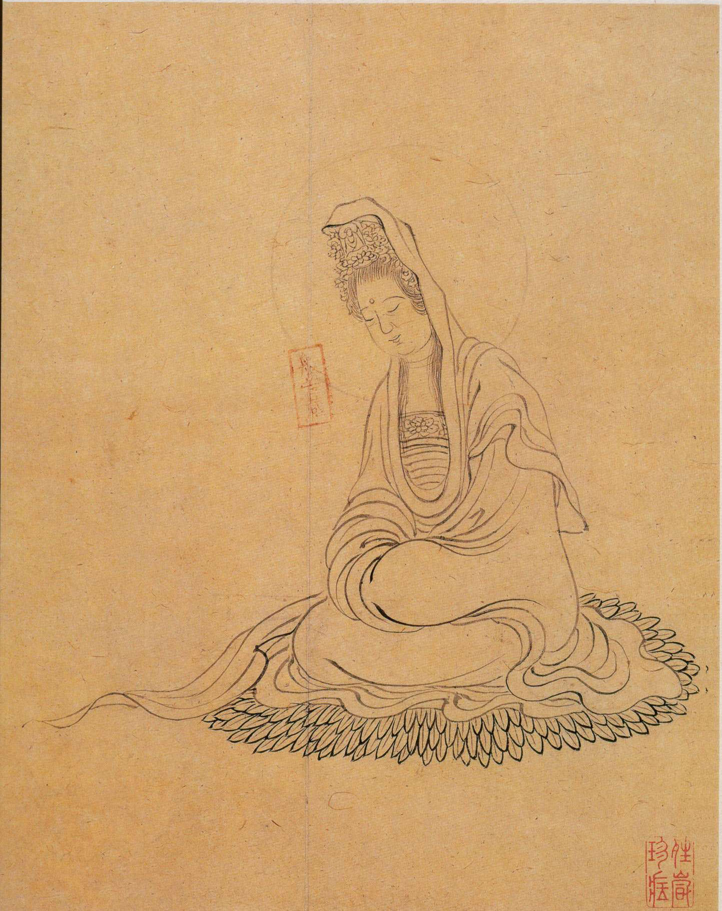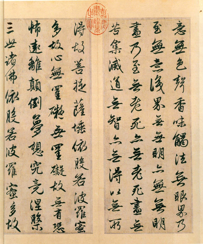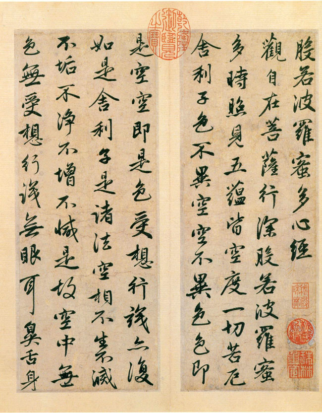 《心经》册页装,3开。第1开前1开,是白描观音大士像。第3开后第1开.是白描韦陀像,后面第2—3开是明王稚登、清张英、张照、励宗万等人跋和原梁清标题签。每单开纵28.8厘米,横10.8厘米。此册原为清张若蔼旧藏,有“炼雪鉴定”、“晴岚居士”等印。乾隆时入清宫,有乾隆、嘉庆、宣统内府藏印。《心经》原为手卷,入清宫后改为册页,并加装檀香木雕花夹板。《心经》前后的《观音像》、《韦陀像》是清人所绘。著录于《秘殿珠林续编》。