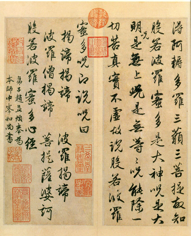 赵孟頫所写《般若波罗蜜多心经》非只一本,此册是写给中峰和尚的。中峰释名明本,号中峰,元代高僧, 主持吴兴弁山幻住庵。元仁宗曾赐号佛慈圆照禅师。圆寂后谥普应国师。中峰小赵孟頫九岁,但赵对中峰执礼