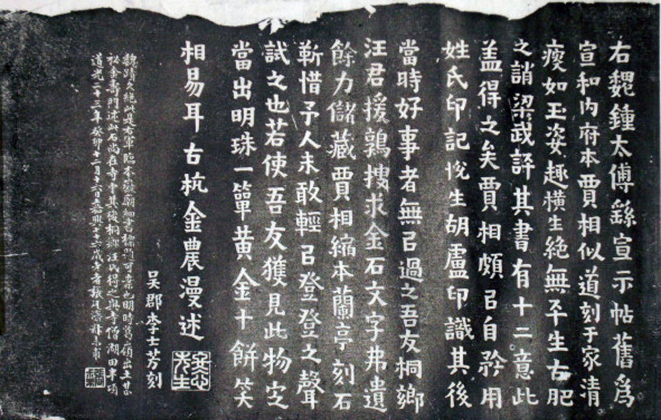 贾似道刻本原石《宣示表》,于2010年5月20日入藏首都博物馆,同年定为一级品,分为原石和附石。原石立装于木桌之上,桌为上好紫檀木所作,做工精细,在桌面内镶嵌附石,横长68厘米,纵宽31厘米,厚10厘米。贾似道刻本原石《宣示表》,原石为长方形,横长62.5厘米,纵宽24.4厘米,厚11.3厘米。《宣示表》,无款,小楷,共十八行,298个字(见图1)。在首行第一至第三个字右侧有标题,“羲之临钟繇帖”,据清代金石学家张廷济考证,为宋徽宗所书。首行右侧刻有“宣和”骑缝印,在文尾最后一字下方,刻有撰文“贾似道印”方印。末行左侧中部刻有篆文葫芦印“悦生”印(“悦生”是贾似道的号)。原石石质坚硬,略呈暗黑,是长年传拓所致,刻字边口硬朗光洁,只是五行到八行下最后一字,因石边损泐稍受影响。其他,除第一行“孙”字,第二行“卿”字,第四 行“爱”字,第七行“又”字,第十六行“表二”两字,第十七行“可”字,第十八行“度”...