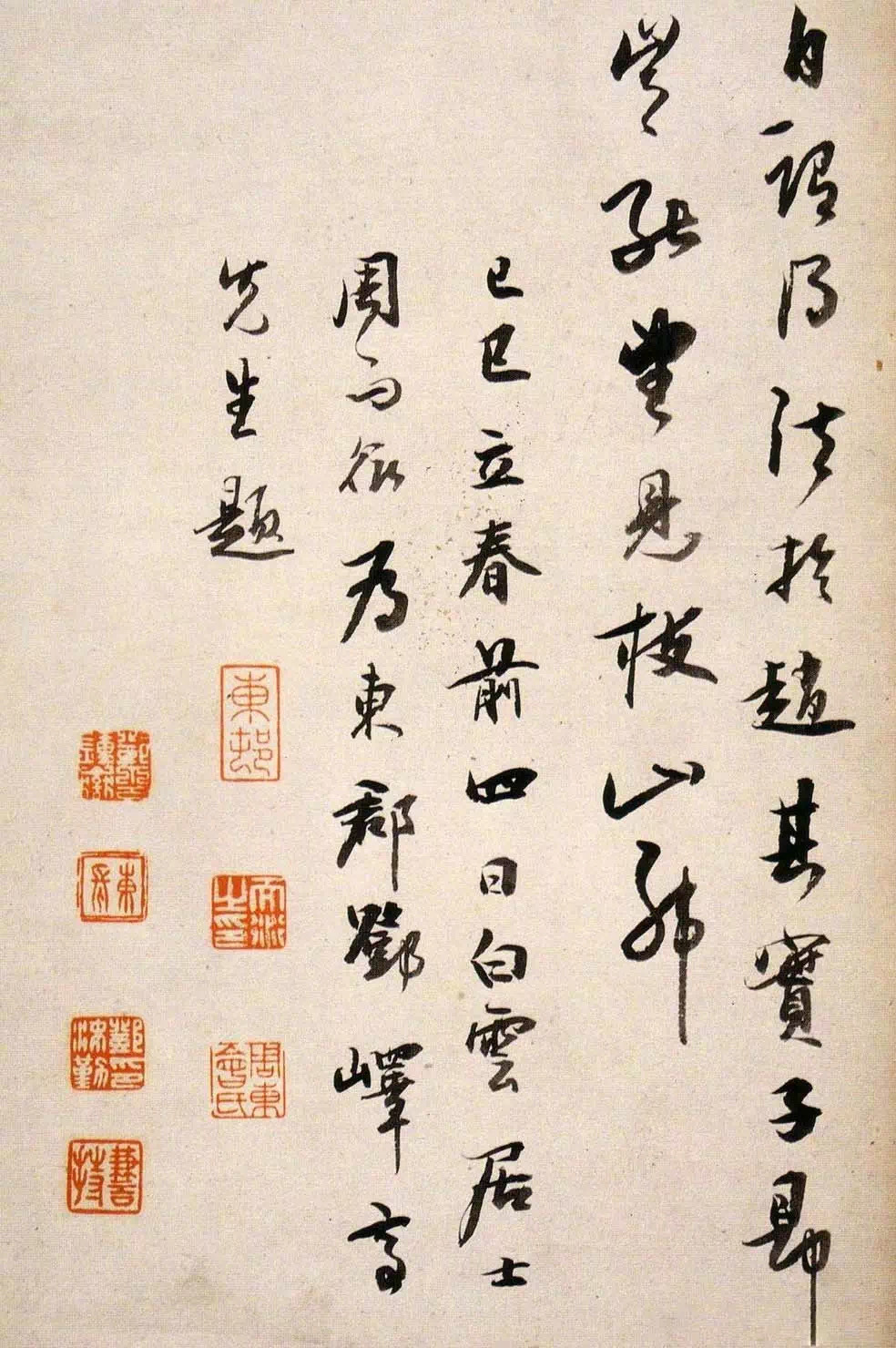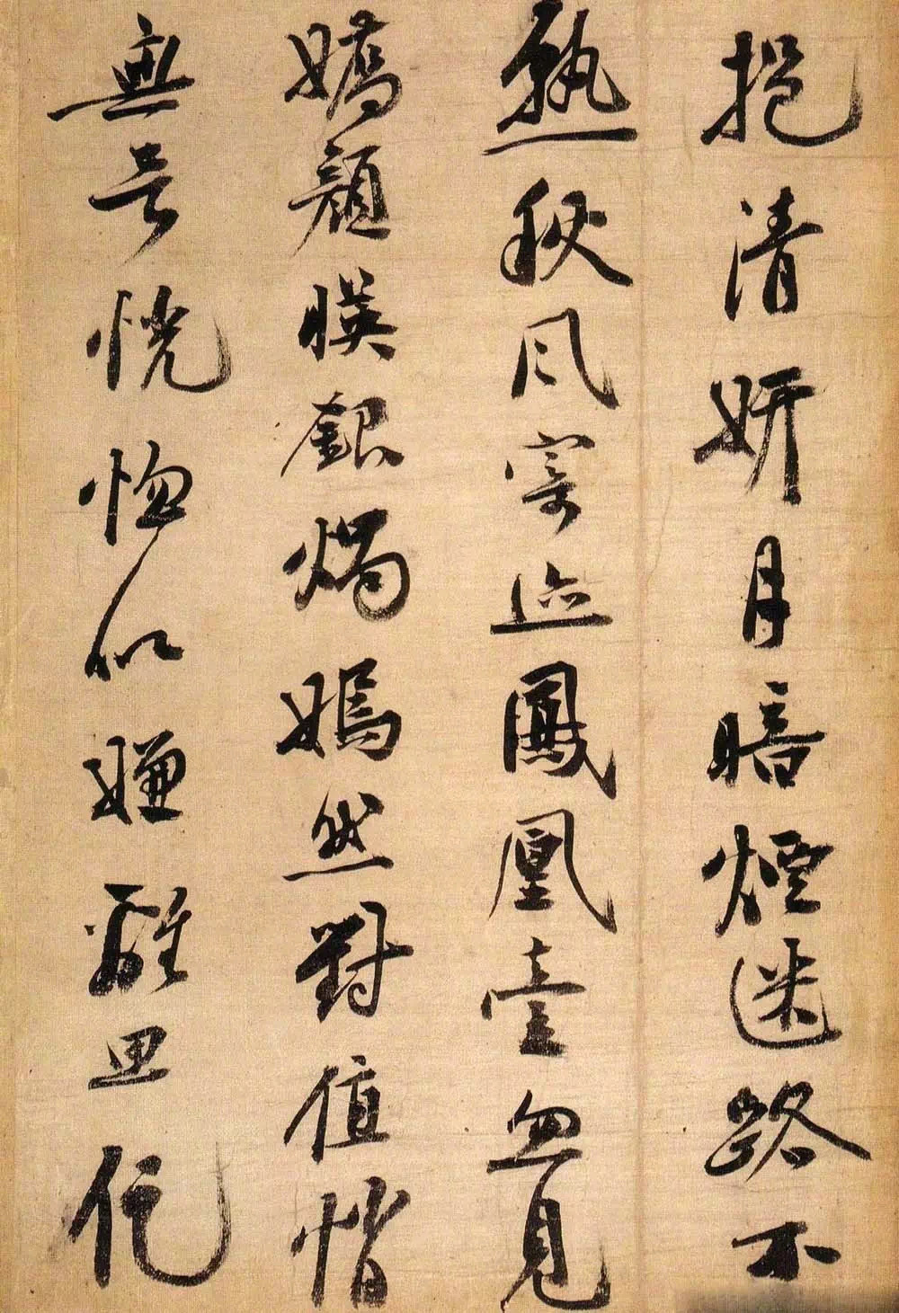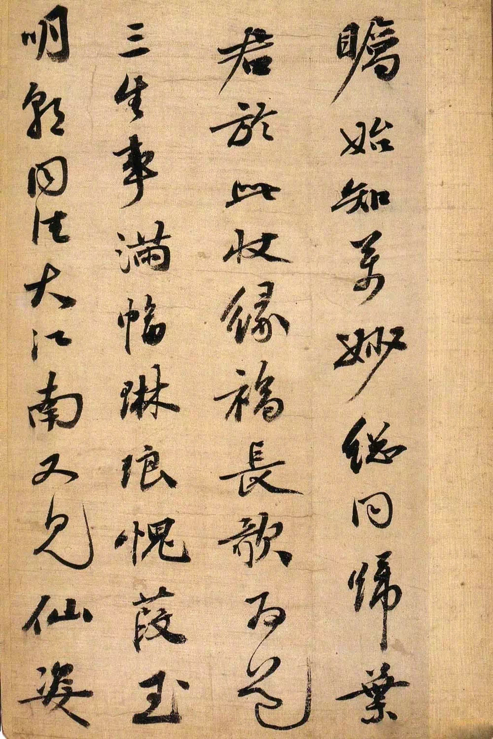 《琼林玉树图歌》,行书,墨迹,绫本册页,纵34厘米,横22.5厘米,戚叔玉藏。此歌乃枝山38岁时在秦淮京舍为《琼林玉树》一图所题。其书行中夹草,遒古萧远,结字纵逸,倾侧跌宕得自山谷,酣畅流动,匀稳妍妙,凝厚劲健如『绵里裹铁』,实出于东坡。诚如白云居士周而衍跋中所云:『往见黄鲁直书子瞻《定慧院海棠诗》,今枝山此卷,诗与字皆用其法。而诗则稍逊子瞻,盖太任真,乃近俚。书则欲青于蓝,其烂漫圆厚处,即子瞻得意时殆难过也。而自谓得法于赵,其实子昂岂能望见枝山耶。』