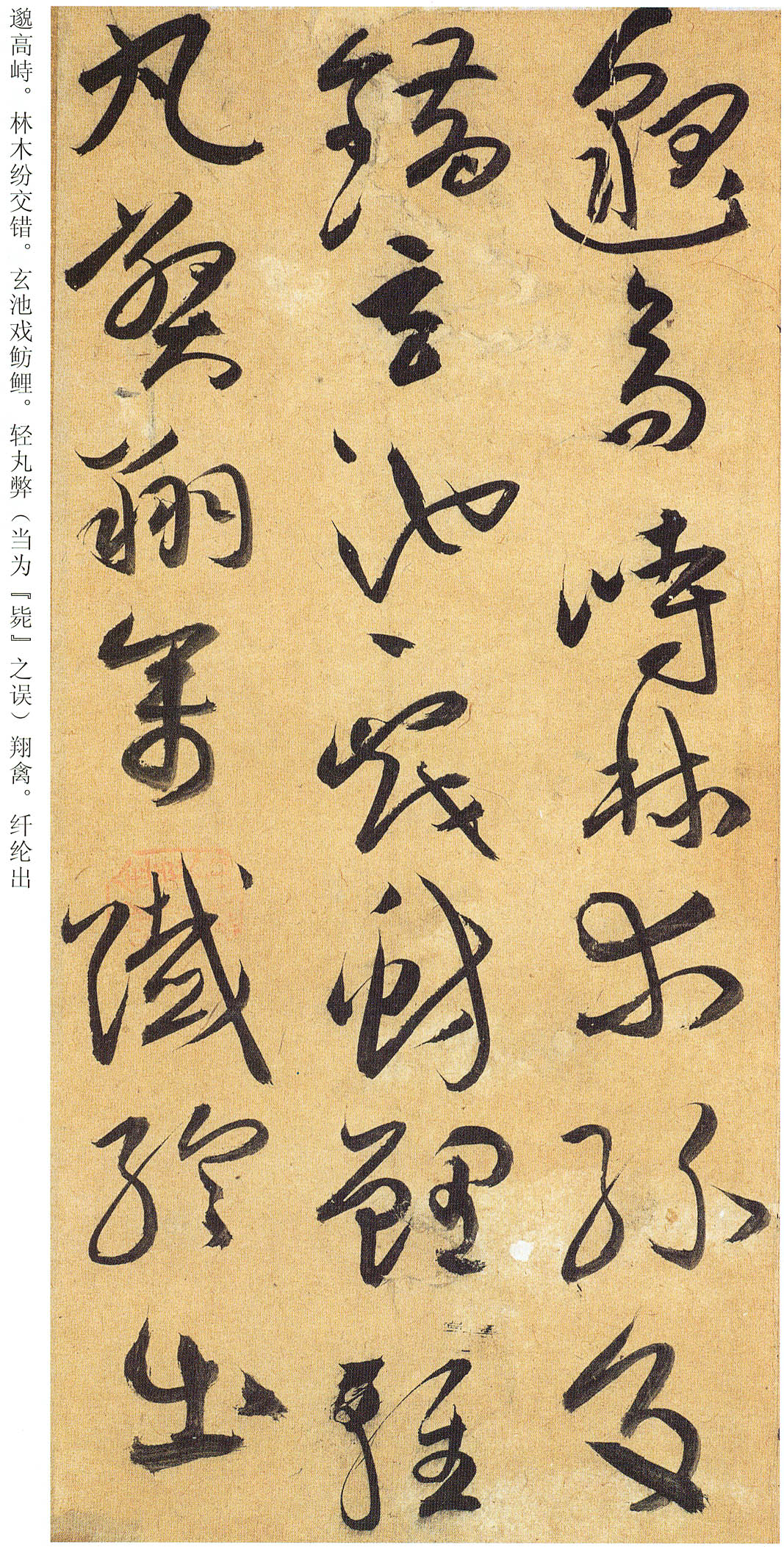 附录《酒会诗》草书释文:乐哉苑中游,周览无穷已。百卉吐芳华,崇台邈高峙。林木纷交错,玄池戏鲂鲤。轻丸毙翔禽,纤纶出鳞鲔。坐中发美赞,异气同音轨。临川献清酤,微歌发皓齿。素琴挥雅操,清声随风起。斯会岂不乐,恨无东野子。酒中念幽人,守故弥终始。但当体七弦,寄心在知己。
