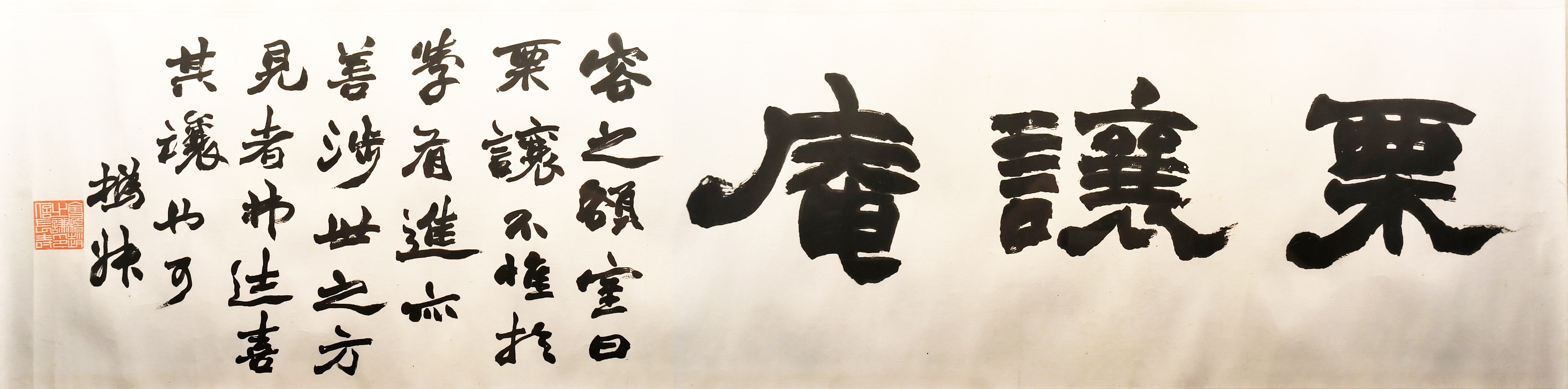 赵之谦《隶书栗让庵横幅》 纸本隶书 31cm×128.4cm 绍兴博物馆藏 释文:栗让庵 款识:容之额室曰栗让,不惟于学有进,亦善涉世之方,见者弗徒喜其让也可。撝叔。 钤印:会稽赵之谦印信长寿(白) 【资料来源】浙江美术馆《朗姿玉畅——赵之谦特展 》2023.12.5-2024.3.3