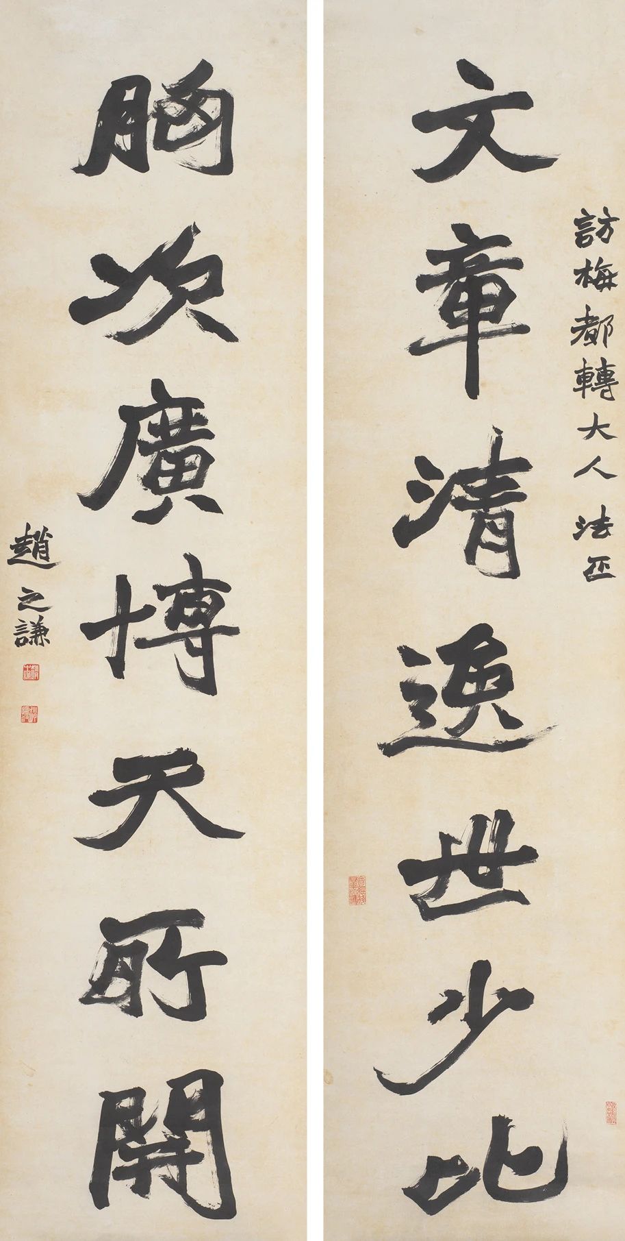 赵之谦《楷书文章胸次七言联》纸本楷书 163cm×41cm×2 君匋艺术馆藏 释文:文章清逸世少比,胸次广博天所开。 款识:访梅都转大人法正 ,赵之谦。 钤印:赵之谦(白)、赵撝叔(白)