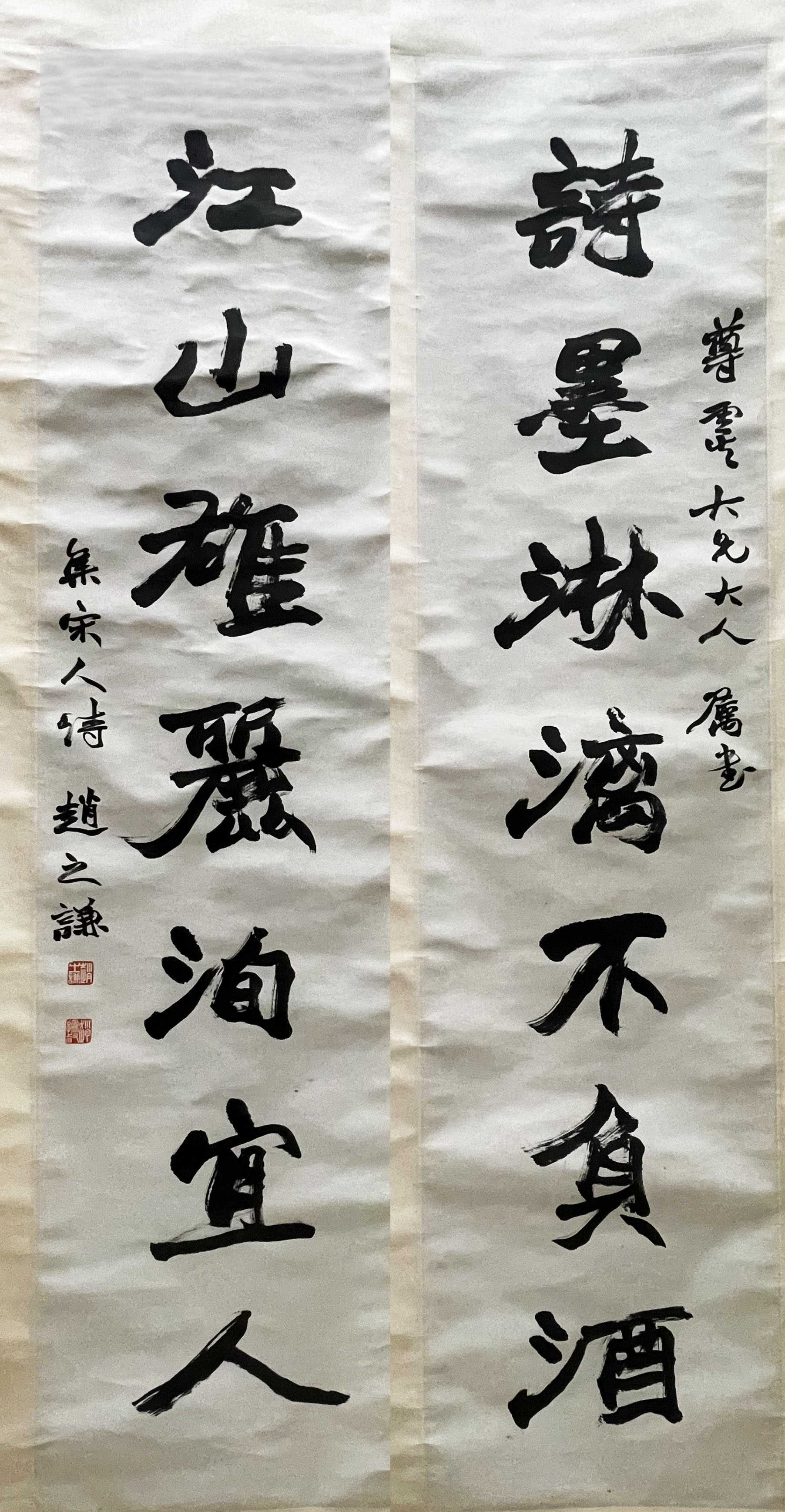 赵之谦《行书诗墨江山七言联》纸本行书 133cm×32cm×2 君匋艺术馆藏 释文:诗墨淋漓不负酒,江山雄丽洵宜人。 。 款识:尊虞大兄大人属书,集宋人诗。治赵之谦。 钤印:赵之谦印(白)、赵撝叔(白) 【资料来源】浙江美术馆《朗姿玉畅——赵之谦特展 》2023.12.5-2024.3.3