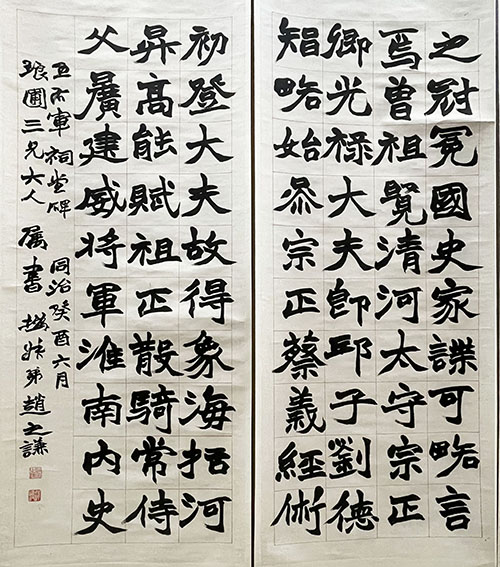 赵之谦《节录王右军祠堂碑四条屏》纸本楷书 114cm×46.5cm×4 1873年 君匋艺术馆藏 释文:略 款识:王右军祠堂碑,同治癸酉六月,琅圃三兄大人属书,撝叔,弟赵之谦。 钤印:赵之谦印(朱)、赵撝叔(白) 【资料来源】《朗姿玉畅——赵之谦特展 》(浙江美术馆 2023.12.5-2024.3.3)