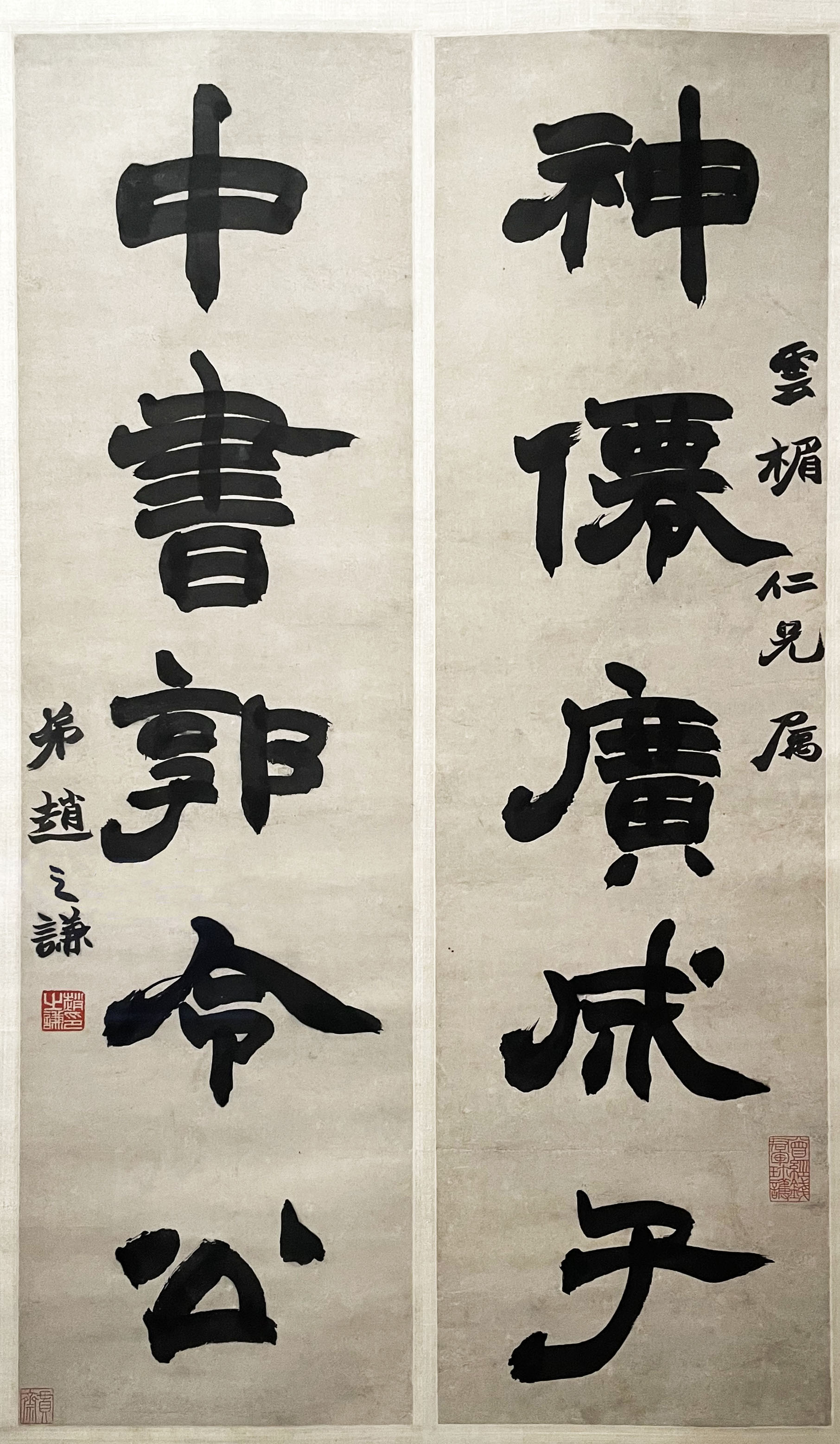 赵之谦《隶书神仙中书五言联》纸本隶书 79.5cm×21cm×2 君匋艺术馆藏 释文:神仙广成子,中书郭令公。 款识:雲楣仁兄属,弟赵之谦。 钤印:赵之谦印(白) 【资料来源】《朗姿玉畅——赵之谦特展 》(浙江美术馆 2023.12.5-2024.3.3)