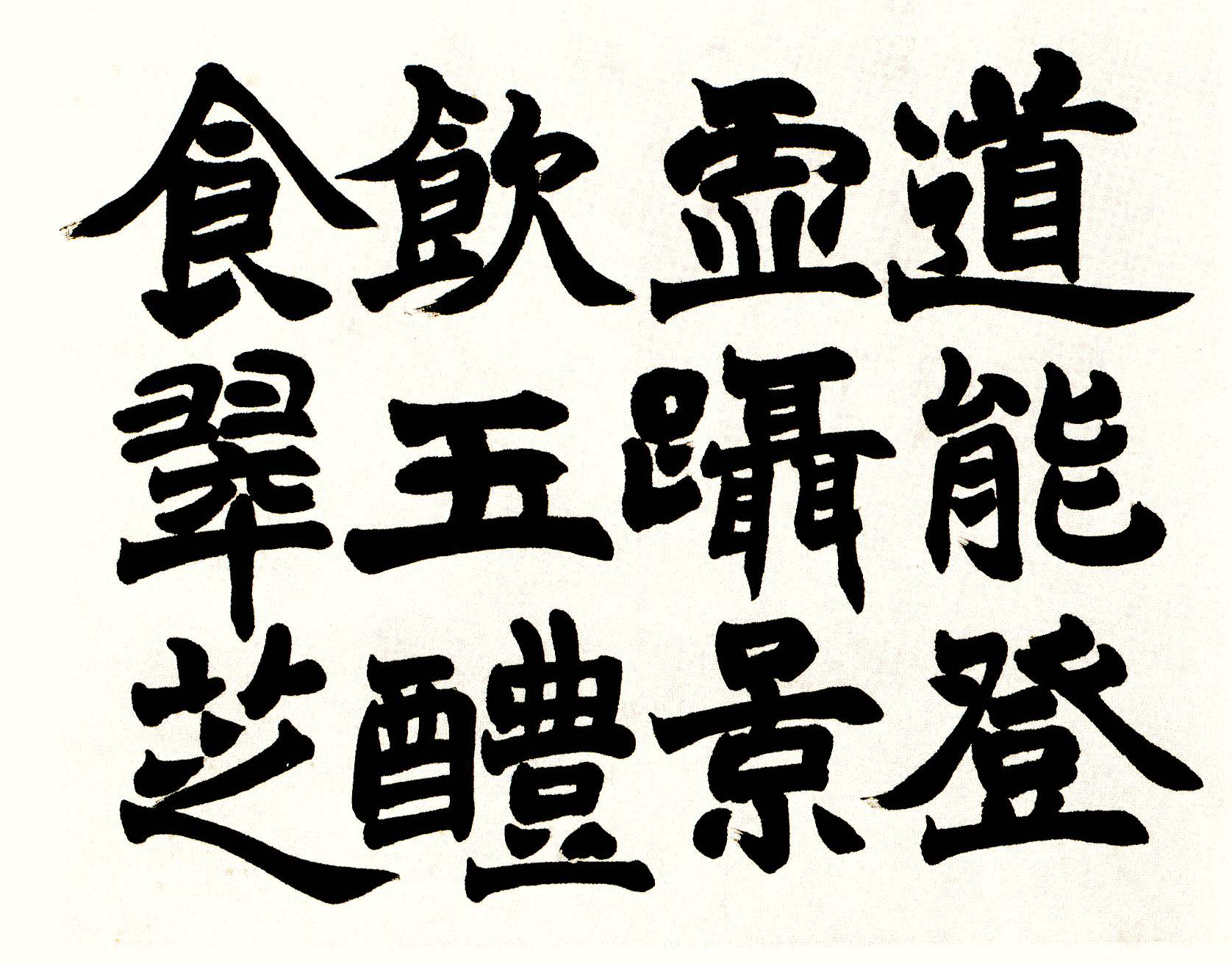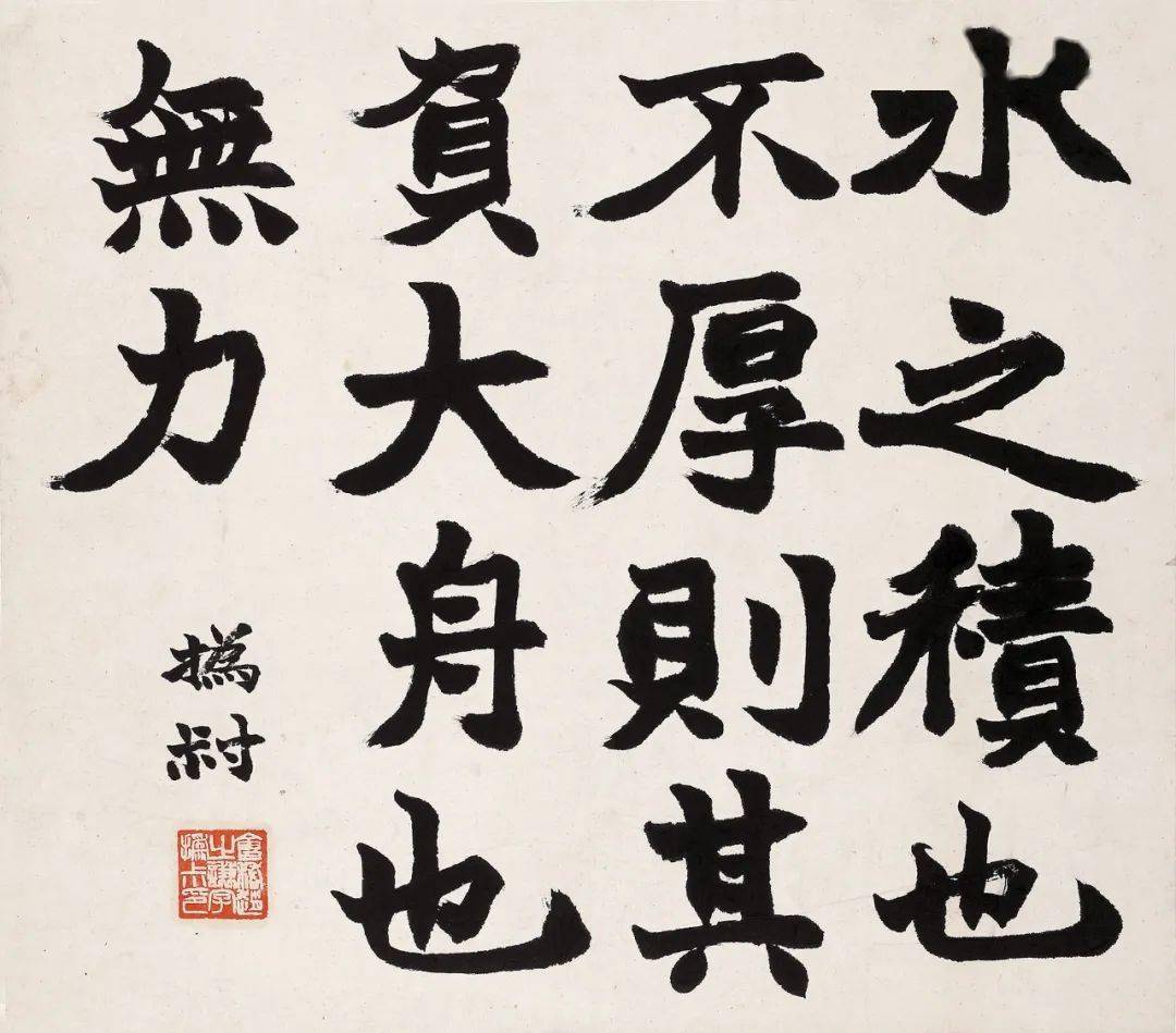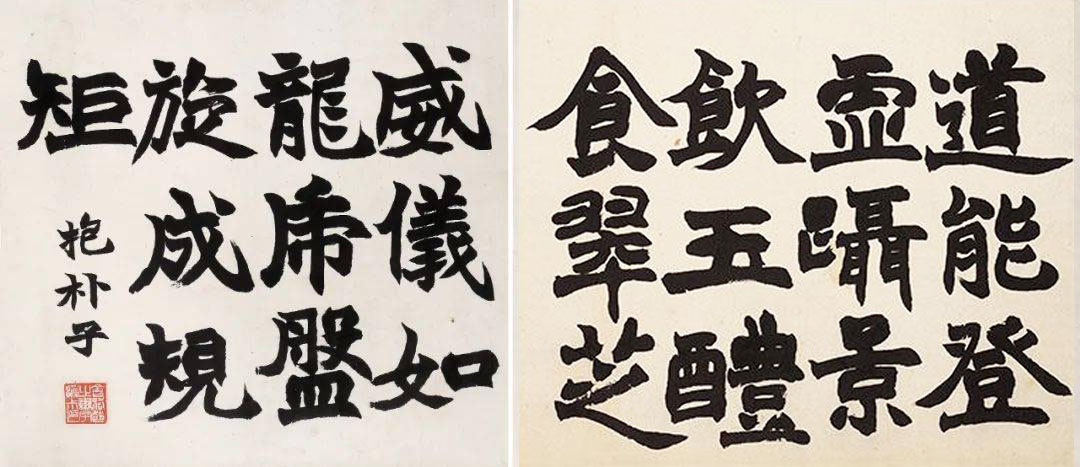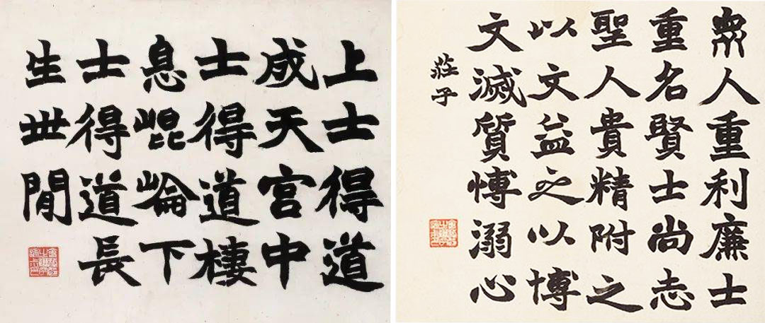 首先引起我们注意的是那九开方劲端厚中不乏飘逸韵致的魏碑楷书,其字形并没有一味模拟魏碑的刀刻感,而是更加注重毛笔书写趣味的传达,从而营造一种有笔有墨、刚中带柔的艺术效果。《体论》《论衡》《庄子·刻意篇》三开字体秀雅峻拔,《昌言》《抱朴子》《商君书》《太平预览》《庄子·逍遥游》等六开笔致则稍微浑厚开张,尤其是《抱朴子》二开,饱满的笔墨中洋溢着强烈的金石气息。这是对于侧锋运用程度的不同所致,而侧锋铺毫正是赵之谦写魏碑所带来的最大转变;不同的笔致说明赵之谦正努力将他在不同魏碑范本中所得到的养分释放到实践中,以此来传达他对魏碑书法的独特理解。虽然有些笔画的收笔和转折比起晚年来显得还没那么放松自如,但在这其中最重要的信息是一些横划出现起笔直入、收笔迅速向右下收尖的写法,这是他从魏碑刀刻笔画中得到的灵感,可以营造出一种潇洒飘逸、笔歌墨舞的动人之美。这种写法在往后的几年中将被大量运用到各种书体中,成为其书法的一大特征。
