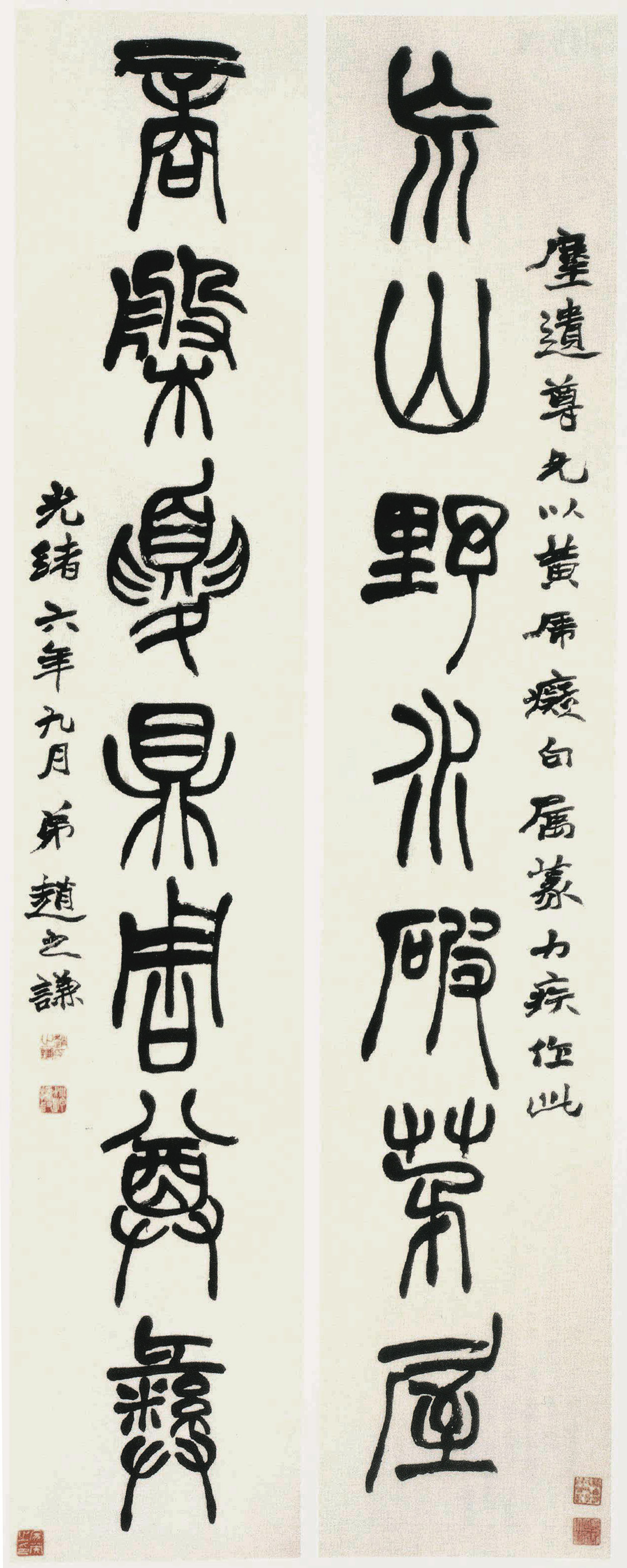 赵之谦《篆书荒山商盘七言联》纸本篆书 123×26.5cm×2 1880年 小莽苍苍斋藏