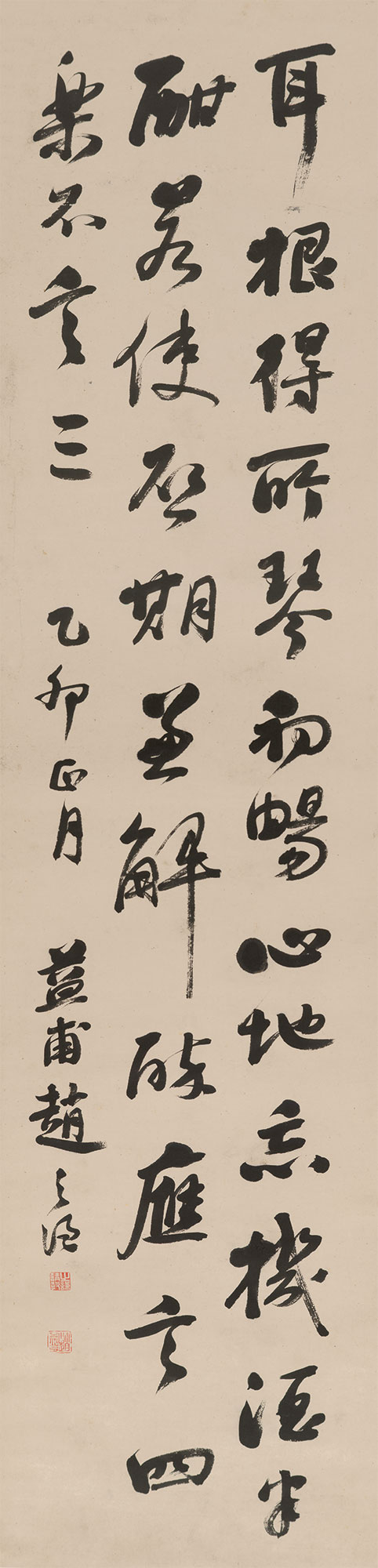 释文:耳根得所琴初畅,心地忘机酒半酣。若使启期兼解醉,应言四乐不言三。 款识:乙卯(1855年)正月 益甫赵之谦。 钤印:之谦请教(白)、赵益父(朱) 行书七绝为其早期作品(26岁时所作),笔画柔和圆润,丰满敦厚,结字严谨规正,一派颜字风貌。此时尚处于师法颜字的阶段,尚未形成自己鲜明的个性,但从中可一窥其深厚的传统功力。
