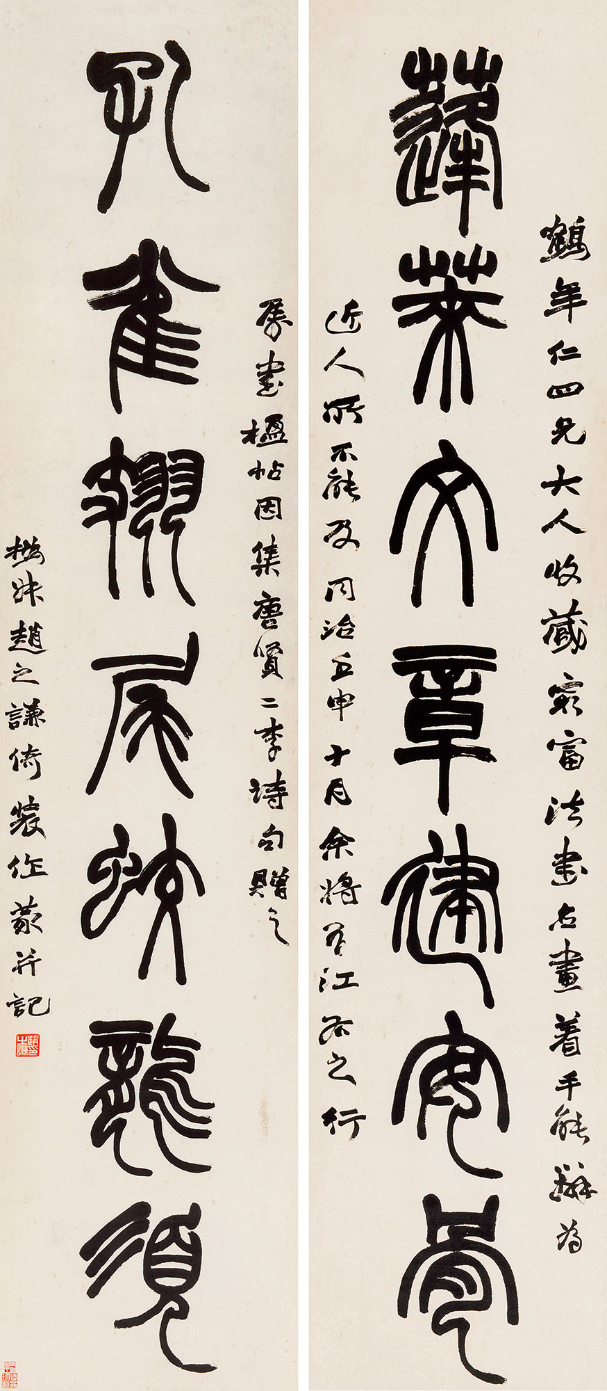 款识:鹤年仁四兄大人收藏穷富法书名画,着手能辨,为近人所不能及。同治壬申十月,余将有江右之行,属书楹帖,因集唐贤二李诗句赠之。撝叔赵之谦倚装作篆并记。
