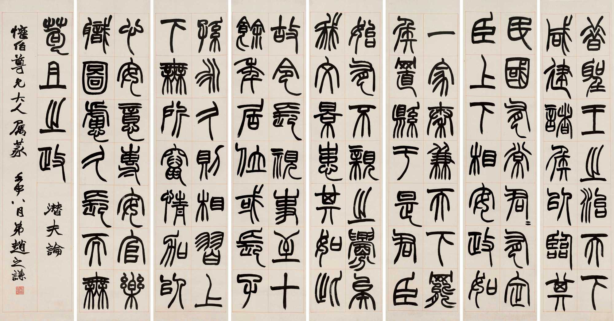 赵之谦篆书《潜夫论》八屏,宣纸本,书宗邓石如,融魏碑笔意,笔势浑厚,结体严整,张弛有度,沉劲俊美兼备,极具视觉感染力。款云“欢伯尊兄大人属篆,壬申(1872年)八月,弟赵之谦”,为我们了解《潜夫论》提供了一点线索。