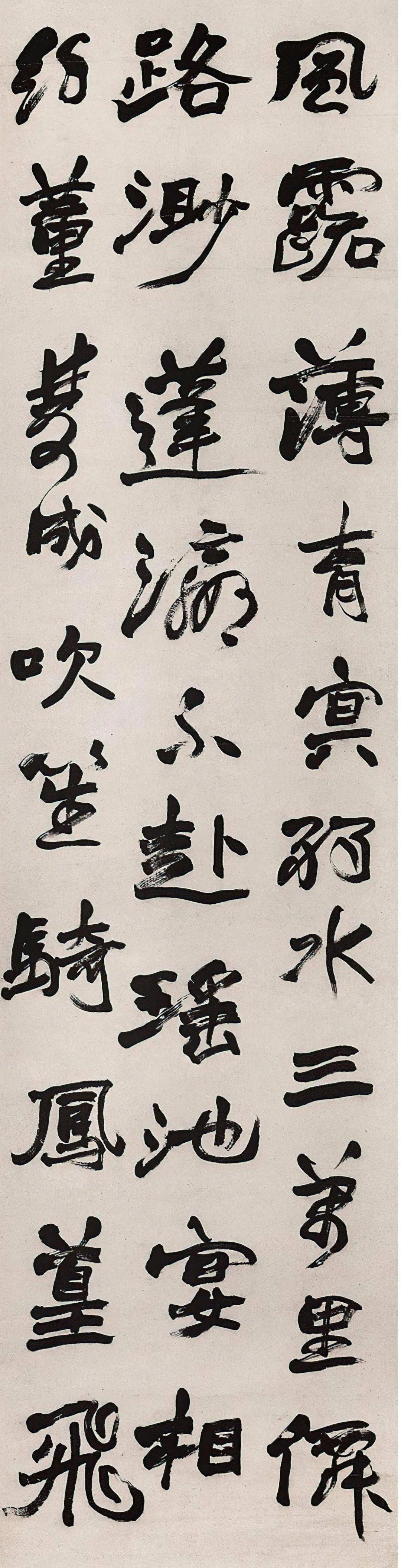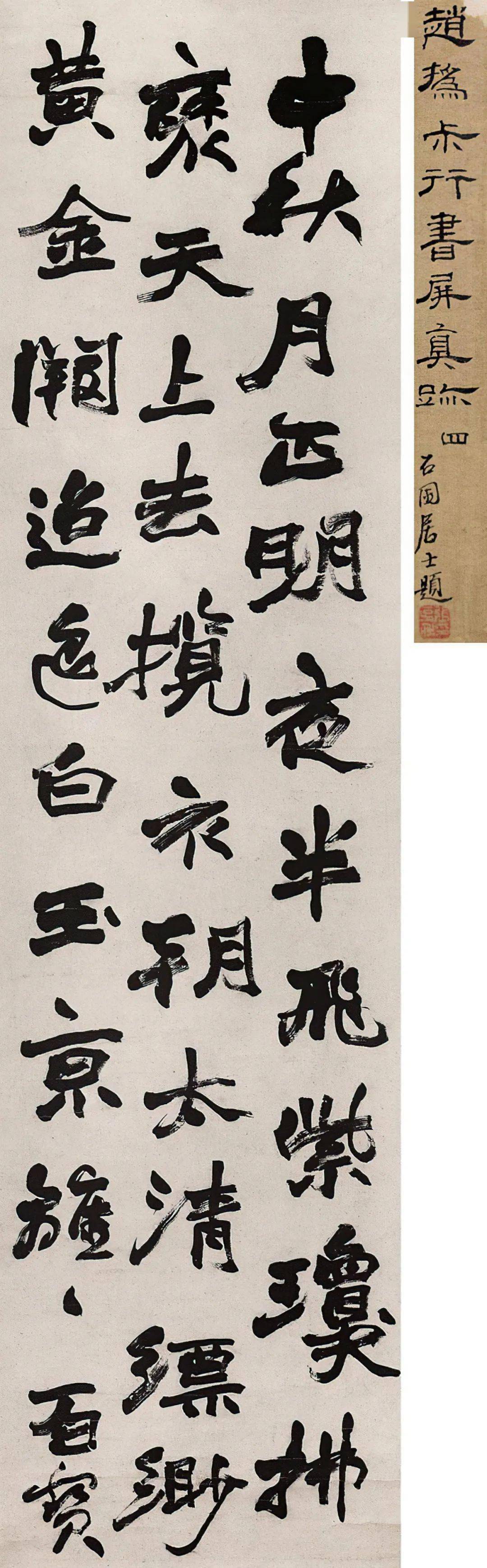释文:中秋月正明,夜半飞紫琼。拂袖天上去,揽衣朝太清。缥缈黄金阙,迢遥白玉京。离离百宝幢,袅袅九华旌。箫韶起碧落,散花飘群英。翱翔鸾鹤舞,清澈云璈声。凌凌九霄寒,风露薄青冥。弱水三萬里,仙路眇蓬瀛。不赴瑶池宴,相约董双成。吹笙骑凤凰,飞上芙蓉城。宋四明陈西麓游仙曲。