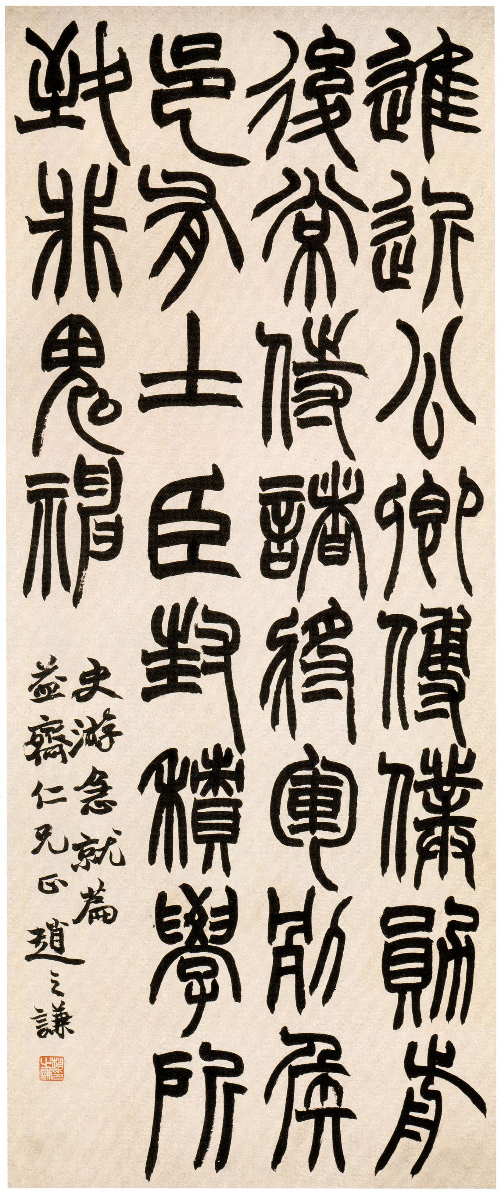 此轴节录史游《急就篇》,末识“史游急就篇,益斋仁兄正。赵之谦。”下钤“赵之谦印”。本幅无藏印。具体创作年代不详,但从书风推测当属赵氏晚年书作。据考,受书人“益斋”可能是上海人陈以谦,字益斋,工诗文词,亦善写兰。