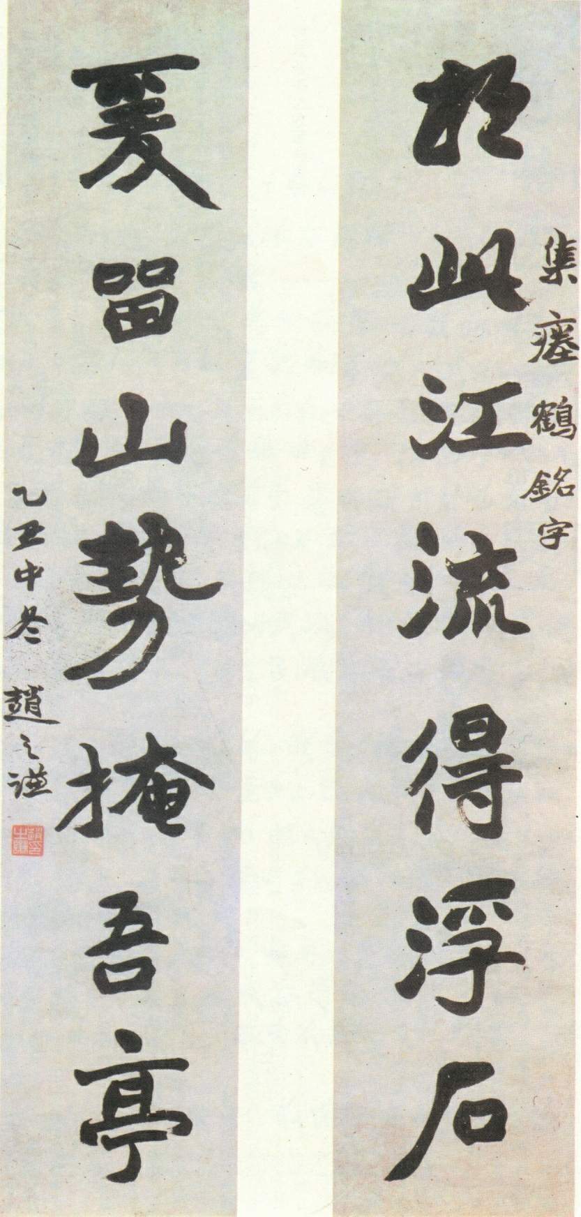 释文:于此江流得浮石,爰留山势掩吾亭。 款识:集《瘗鹤铭》字。乙丑中冬,赵之谦。 钤印:赵之谦印(白) 【资料来源】