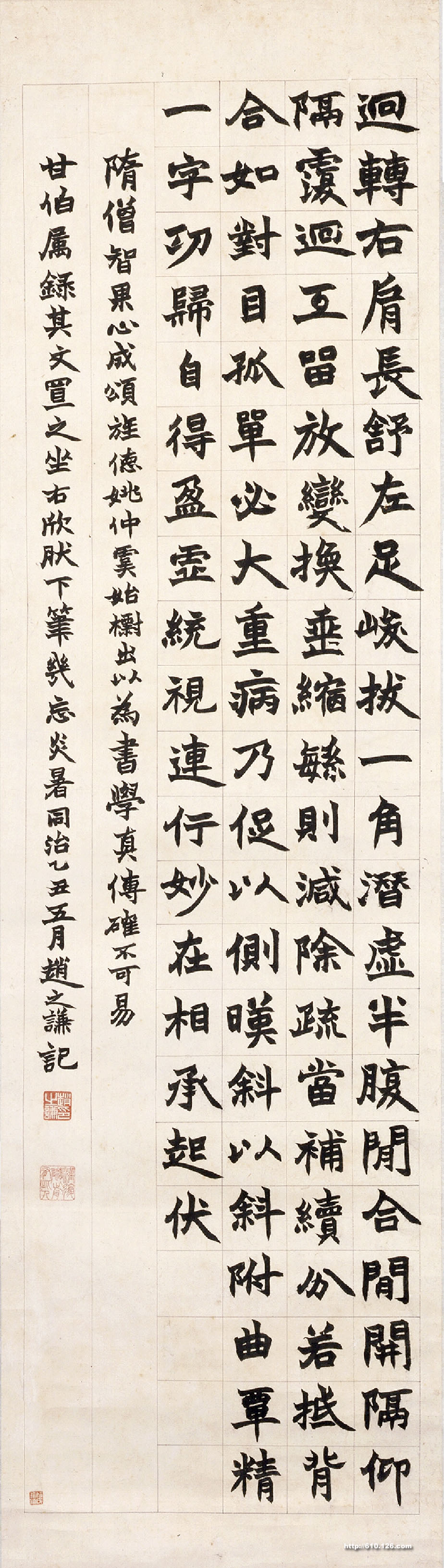 此轴楷书录隋代僧人智果所作《心成颂》文,全幅共6行,满行22字,末署款识:“同治乙丑五月赵之谦记。”下钤“赵之谦印”、“汉后隋前有此人”印二方。左下角钤“师氏珍藏”收藏印一。裱边有师守玉题一行,钤“师守玉印”。此轴是赵之谦应友人“甘伯”之请而书,时当同治四年乙丑(1865年),赵氏37岁。