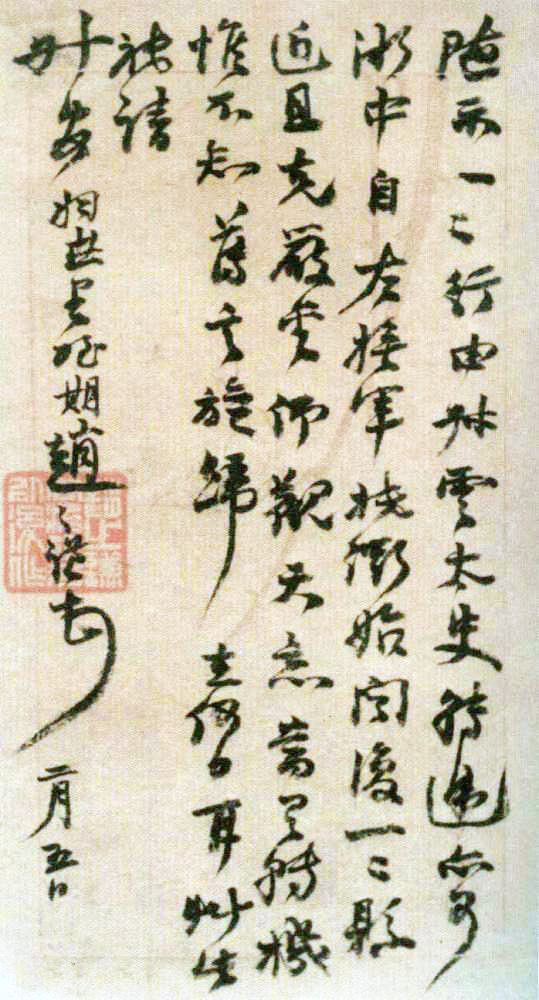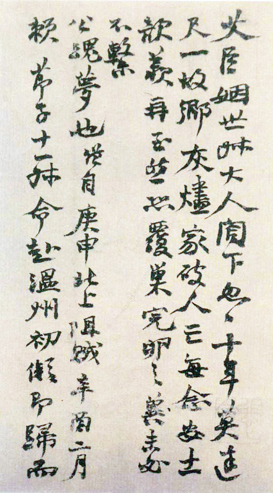 释文:艾臣姻世叔大人阁下:忽忽十年,莫进尺一。故乡灰烬,家破人亡,每念安土,歆羡再至,然恐覆巢完卵之冀,未必不系公魂梦也。谦自庚申北上阻贼,辛酉二月赖节子十一叔命赴温州,初拟即归,而