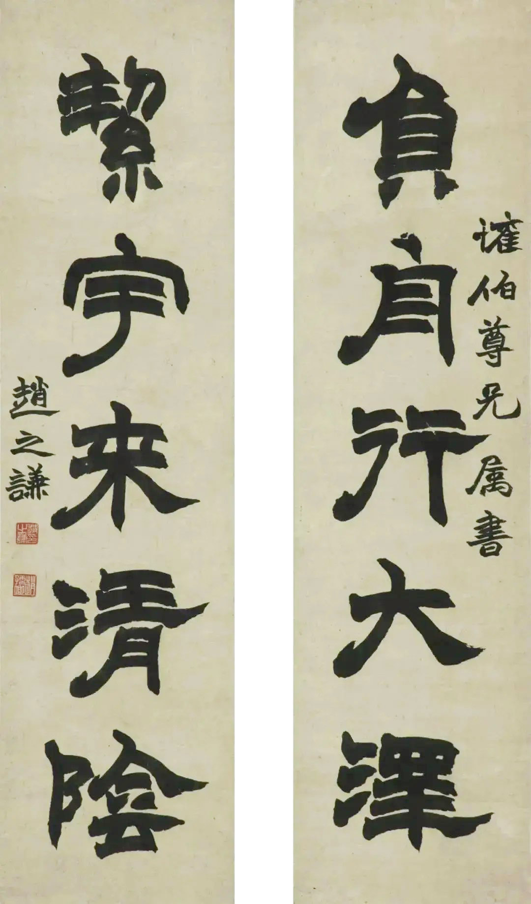 赵之谦《隶书负舟絜宇五言联》纸本隶书 98.5×25.5cm 浙江省博物馆藏 释文:负舟行大泽,絜宇来清阴。 款署:懽伯尊兄嘱书。赵之谦。 钤印:赵之谦印(白文)、赵孺卿(白文) 【资料来源】《吴风赵格》——吴让之赵之谦书画印珍品展(浙江省博物馆 2016.9.22-11.30) 《朗姿玉畅——赵之谦特展 》(浙江美术馆 2023.12.5-2024.3.3)