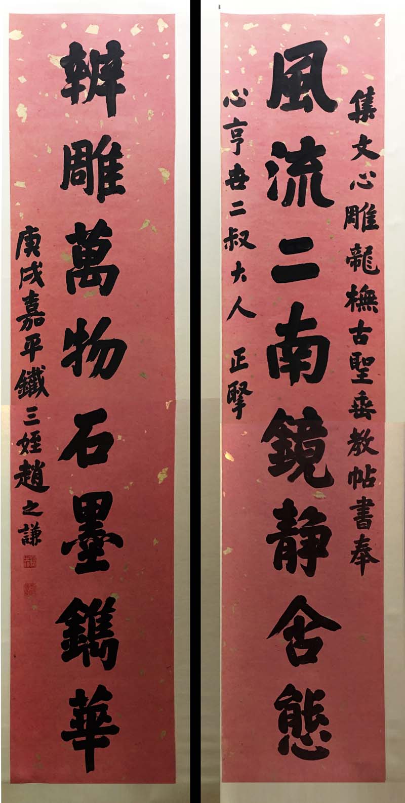 楷书“风流辨雕”联是赵之谦在道光三十年(1850年)所作,当时他才二十二岁,据传是赵之谦现存最早的书法作品。