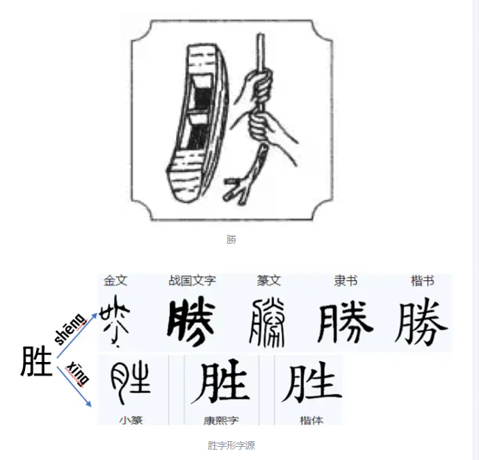 胜,金文从力,乘声。战国文字将“乘”改为“朕”声,“力”均在下方,表示力量能承受。篆文继承之,“朕”字篆文偏旁原先从“舟”,后隶书改成“月”,指用力划桨之义。故“朕”表声兼义,整个字也表示力量能够承受的住。隶书将“力”省成“刀”,楷书又继承篆文定形为“勝”。规范简化字形为“胜”, 旧读sheng,今读shèng
