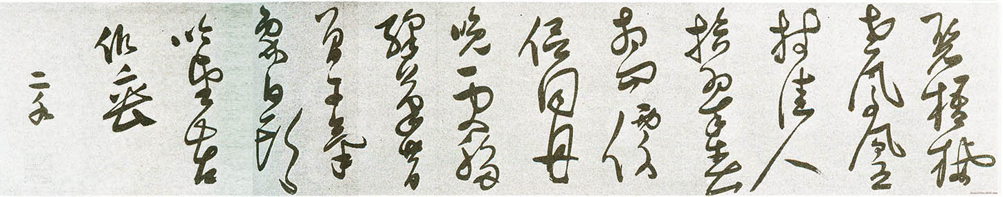 张瑞图早年草书受祝允明影响颇深,其万历二十四年(1596)十月临草书《杜甫渼陂行诗卷》(辽宁省博物馆藏)即是这种面目的代表作。此卷虽仍然保留了较浓的祝氏影响,但用笔的纵横开张和点画的形态变化都比前者更加自由和丰富,草法也更加熟练和恣肆。若与天启元年(1621)所书的行草书《感辽事作诗卷》相比,则笔法和结构又不似后者那样已初步形成自己独有的面目和习惯。另外,此卷落款仅有“二水”两字,亦是天启以后书作中所不见的。从以上几点来推断,此卷应是作于万历二十四年到天启元年之间。